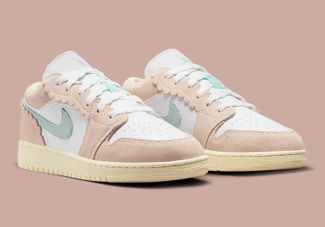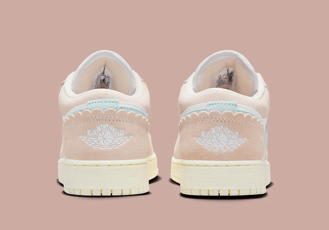 Semblables à des froufrous (surtout dans leur couleur rose clair) les panneaux susmentionnés prennent la place des appuis-œil et des contreforts du talon de la Air Jordan 1 Low. Bien que les autres empiècements soient de la même couleur, leur coupe est beaucoup plus standard. Le Swoosh en daim est tout aussi typique, sa finition bleu clair s’accordant avec les marques adjacentes telles que la broderie Wings le long du talon et le Jumpman sur la languette. Des bases en cuir blanc complètent l’empeigne, ainsi que la languette et les lacets, tandis que les semelles intermédiaires jaunies se trouvent juste en dessous.