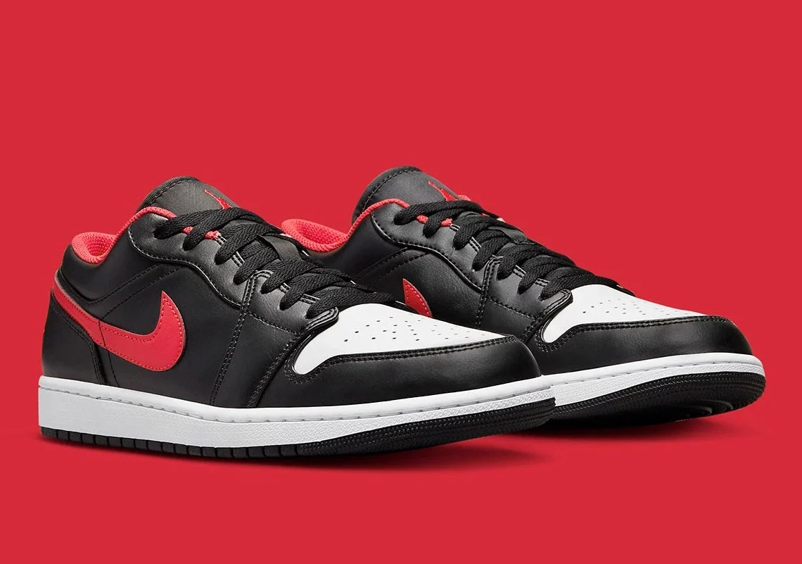 La Air Jordan 1 Low (et, dans une mesure similaire, la Mid) reprend souvent les couleurs les plus appréciées du Jumpman. C’est le cas d’un grand nombre de colorways antérieurs, ainsi que de cette nouvelle version, qui reprend l’utilisation du blanc, du noir et du rouge, mais dans une disposition relativement nouvelle.