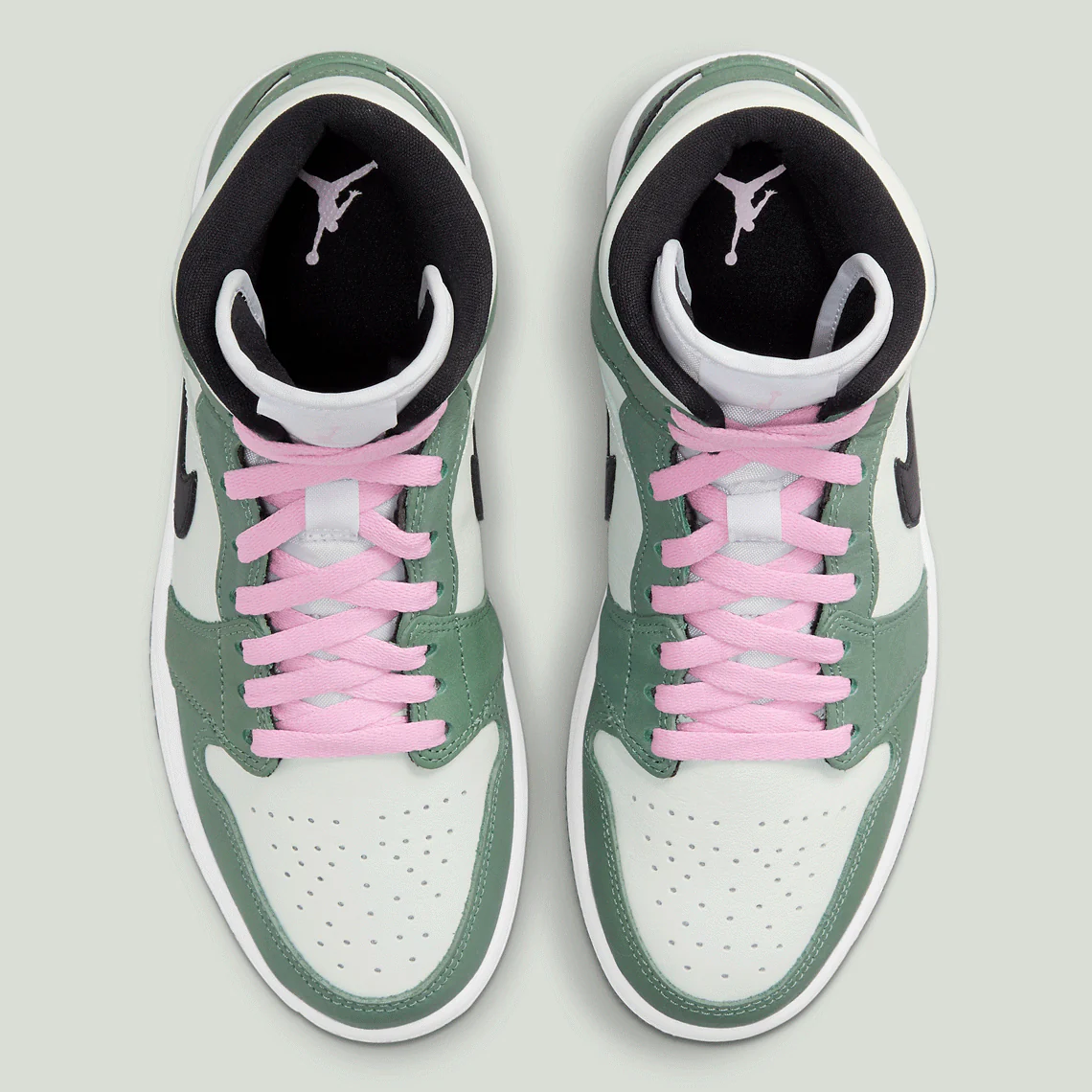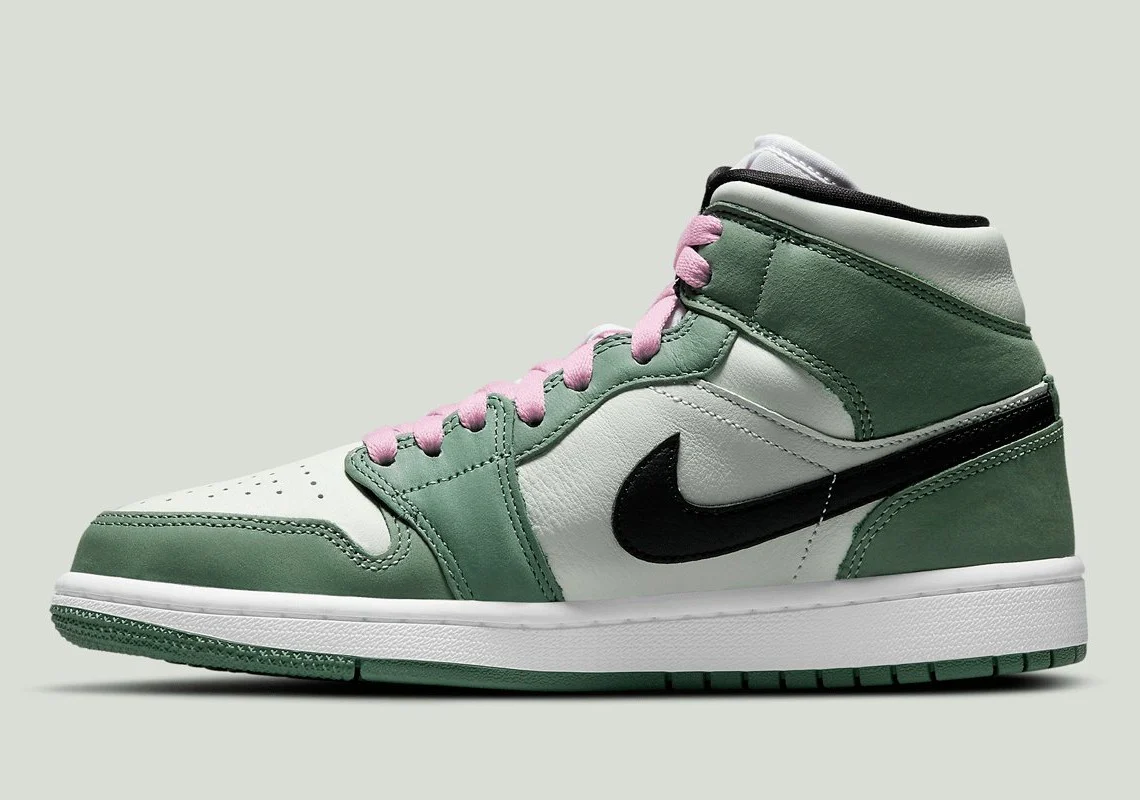 La Air Jordan 1 Mid a eu une année 2020 chargée, et alors qu’elle a laissé ses homologues plus petites et plus grandes faire les gros titres en ce début d’année, le modèle a commencé à dévoiler certaines de ses nouveautés. Un exemple concret : une option « Dutch Green/Black/Barely Green » avec des lacets roses particulièrement adaptés. Le vert pâle sert de décor à des superpositions dans un ton rappelant les vêtements militaires.