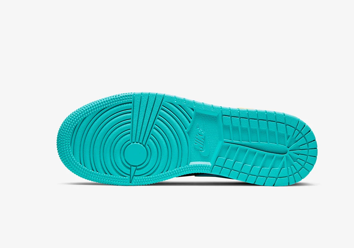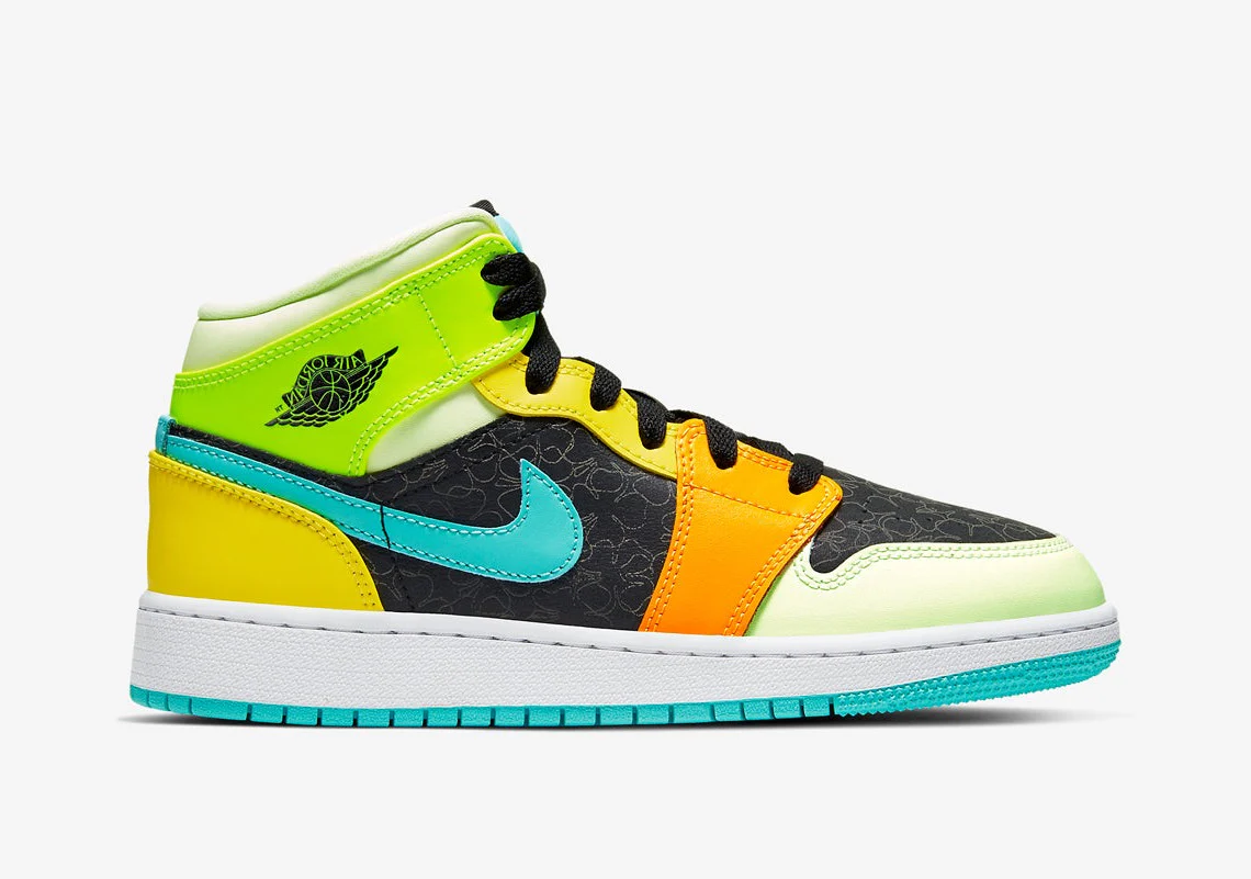 Habillée de couleurs divergentes, la future Jordan 1 Mid s’inscrirait parfaitement dans la collection « Fearless Ones » de l’année dernière. Bien qu’elle ressemble le plus à la contribution de Melody Ehsani à l’ensemble des 13 pièces, cette itération pour enfants renonce à tout texte sur la semelle intermédiaire, à la doublure de montre et à l’alternance des palettes entre la chaussure droite et la chaussure gauche. Au lieu de cela, la paire reste « standard » avec des lacets noirs sans matériel, des semelles intermédiaires blanches et des arrangements identiques en vert, orange, sarcelle et jaune sur les deux chaussures. Cependant, même si les Swooshes et les semelles extérieures turquoise, les renforts de l’œil et du talon « Opti Yellow » et les rabats de cheville « Aurora Green » attirent l’attention, les boîtes à orteils et les panneaux du milieu du pied « Black » volent la vedette grâce à leurs trèfles à quatre feuilles réfléchissants.