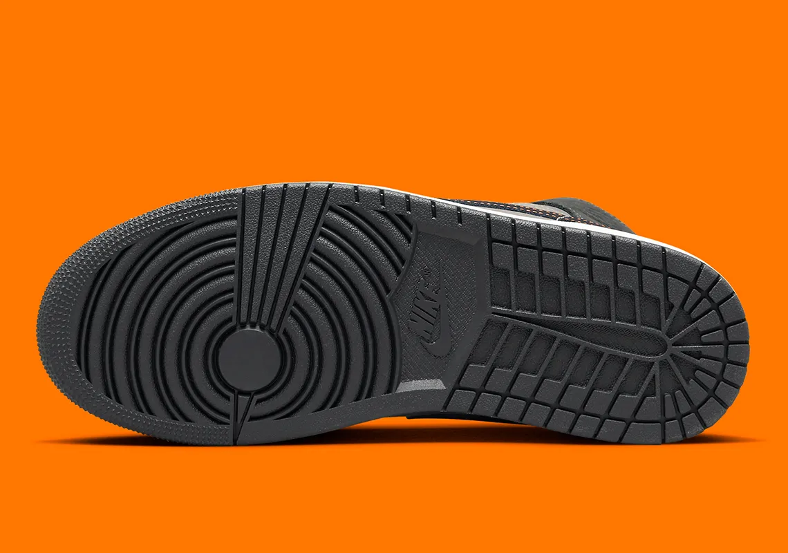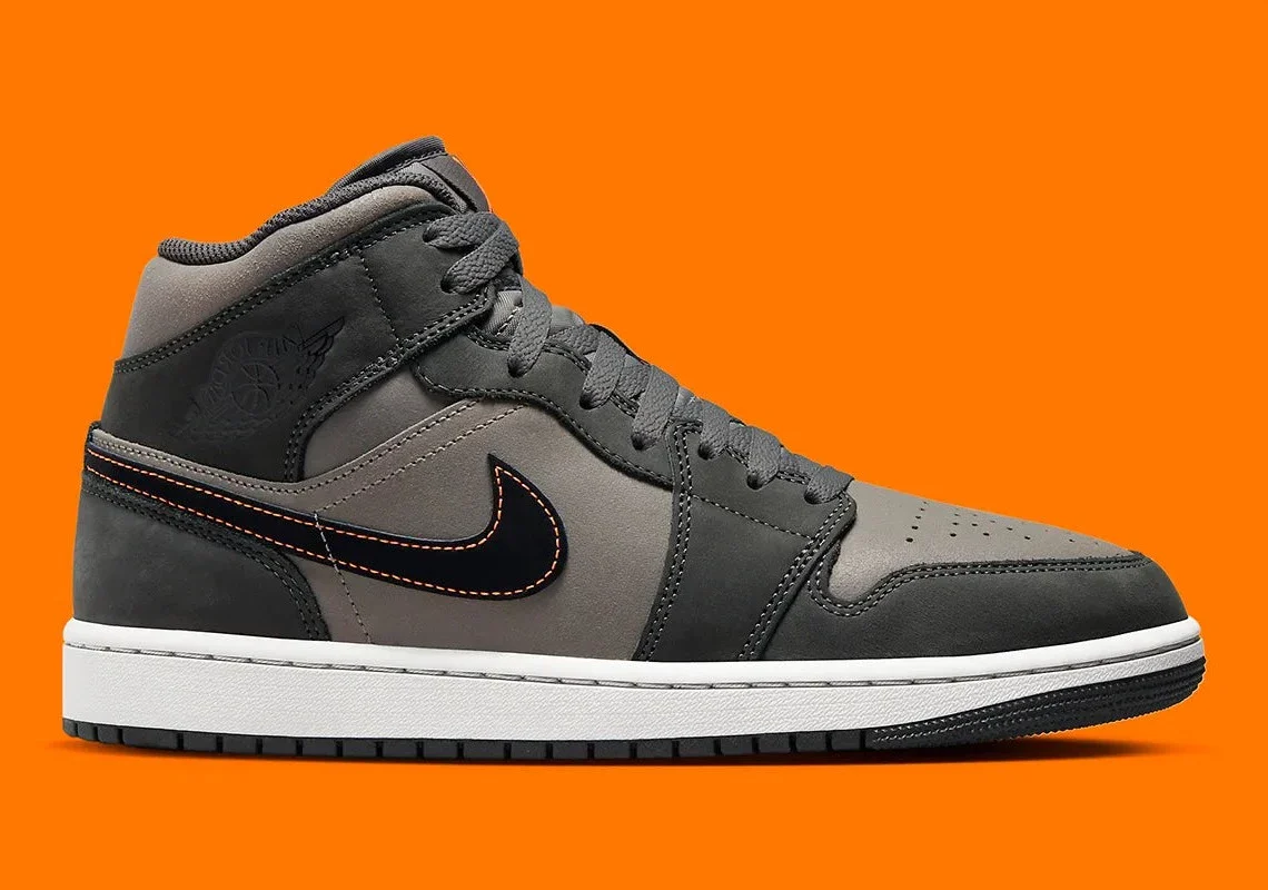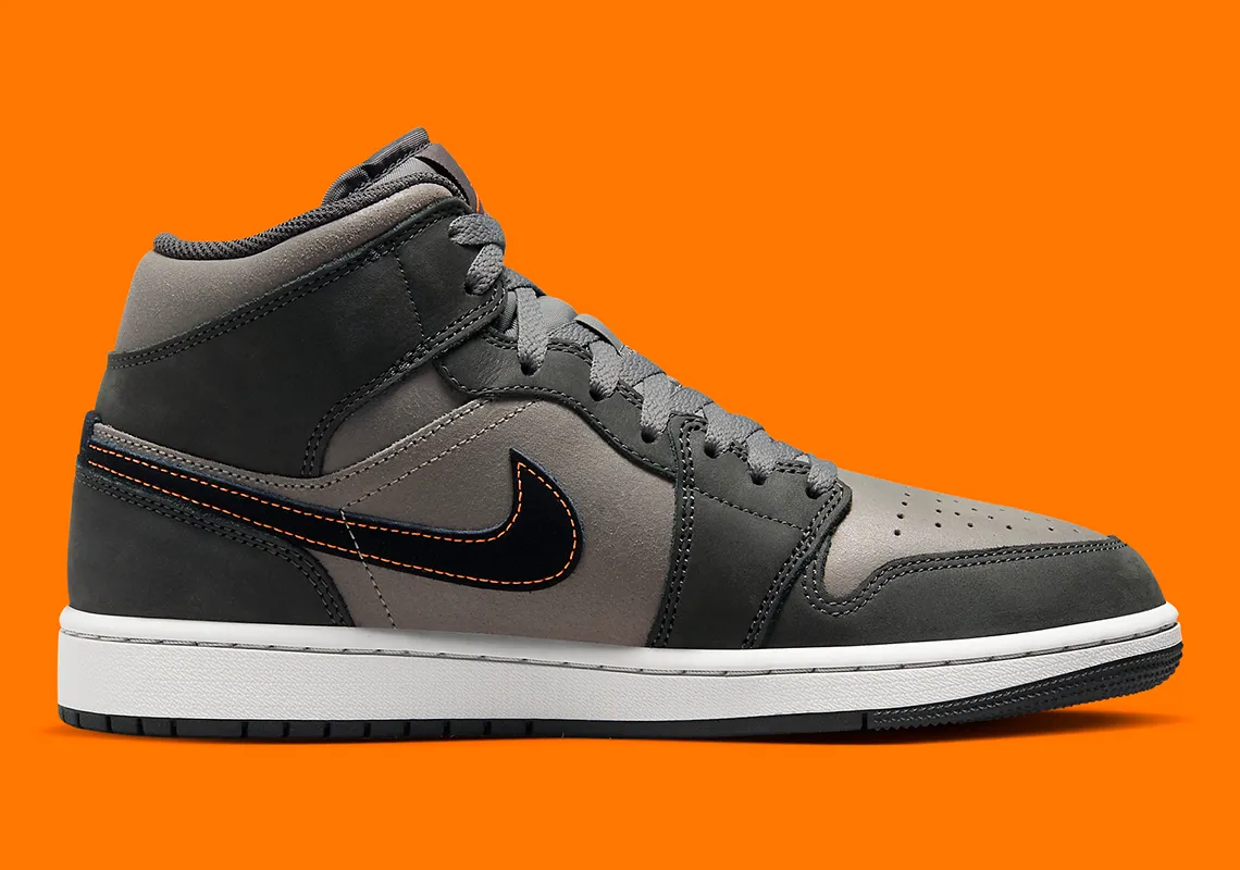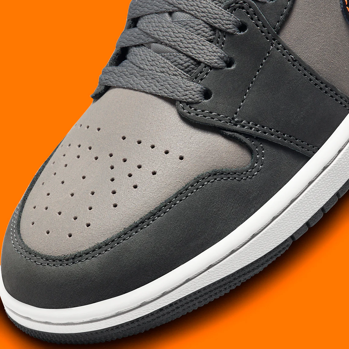 La partie supérieure est composée d’un duo de textures, avec du daim lisse et du nubuck craquelé, dans une palette de gris ton sur ton. Ce dernier est rarement traité le long de l’empeigne et de la base du col gris étain, tandis que le panneau médio-pied de couleur assortie présente une finition en daim. Les empiècements gris foncé ajoutent de la complexité au mélange, tout comme les lacets gris clair et la languette visiblement rembourrée. De plus, les languettes et les bandes noires du profil sont illuminées par un logo Jumpman orange fluo et une bordure surpiquée, respectivement.