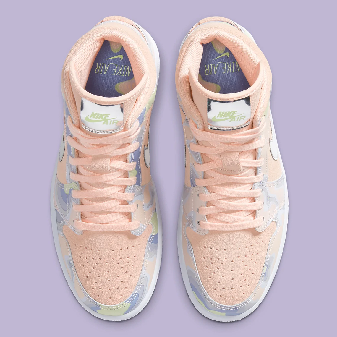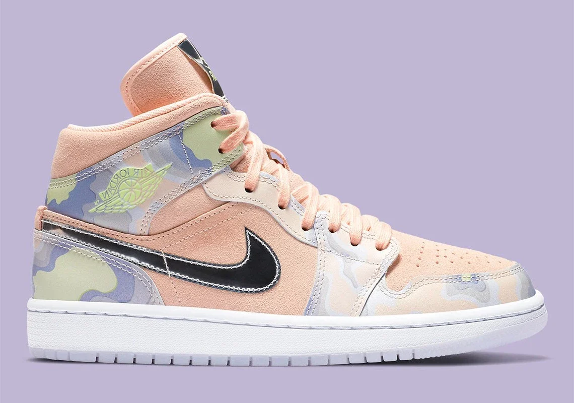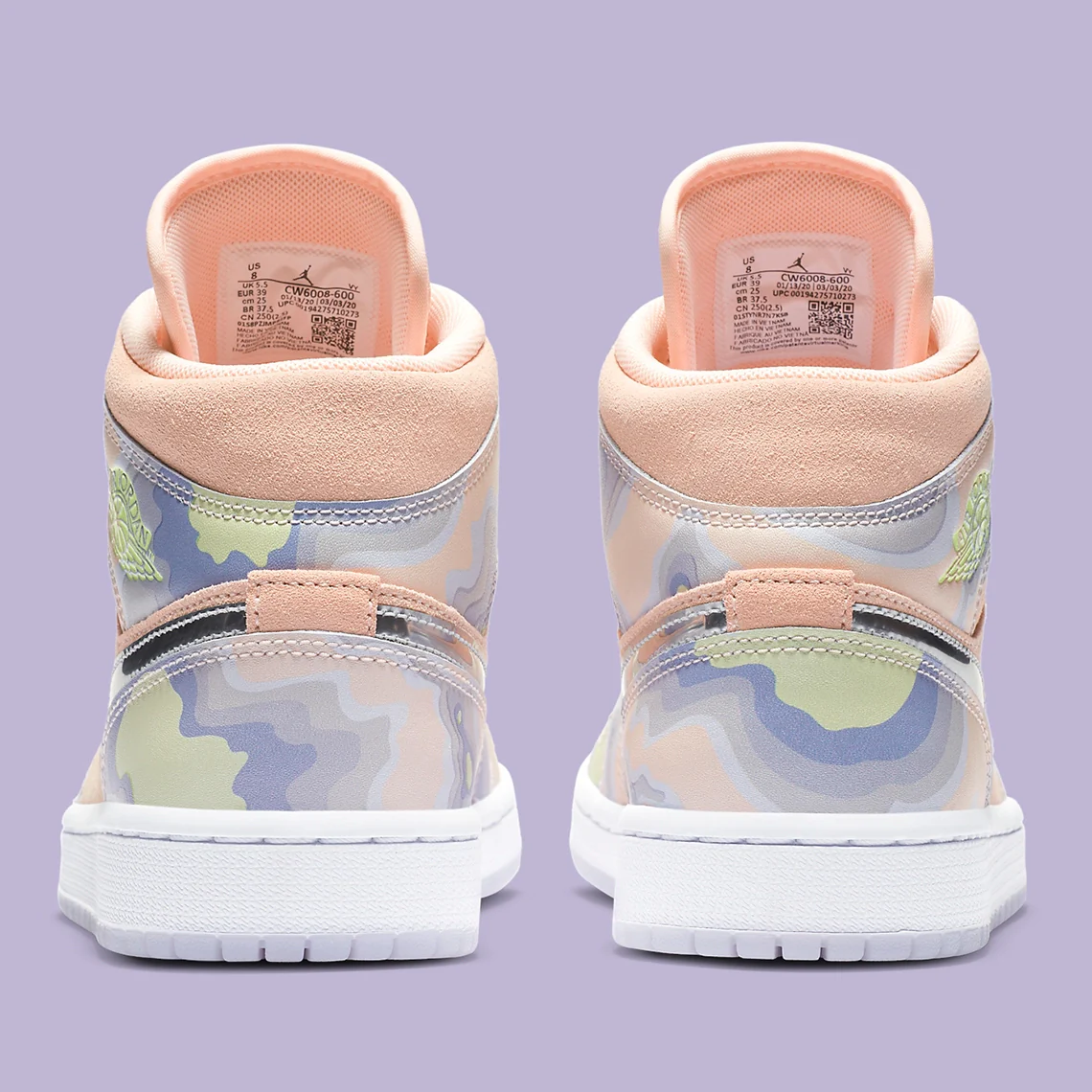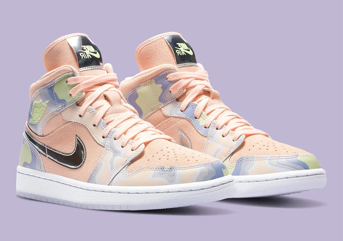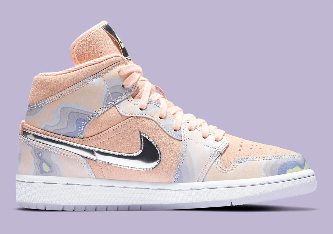Dans la foulée de la sortie de son maquillage « Euro Tour » avec des Swooshes en forme d’éclairs, ainsi que de la révélation de son imminent coloris « Olympic » pour les enfants, la Air Jordan 1 Mid est maintenant prête à livrer une version spéciale cette semaine. Servant de modèle phare pour la collection P(HER)SPECTIVE de Foot Locker, ces baskets sont un appel aux nuages puisque ses superpositions sont traitées avec des graphiques inspirés des cumulus arrangés avec des accents de volts et de violets pastel. En dessous, la base et les languettes en daim sont teintées à l’identique dans un ton pêche, tandis que les Swooshes alternent entre des apparences argentées métalliques sur le côté latéral et des finitions angéliques sur le côté médial.