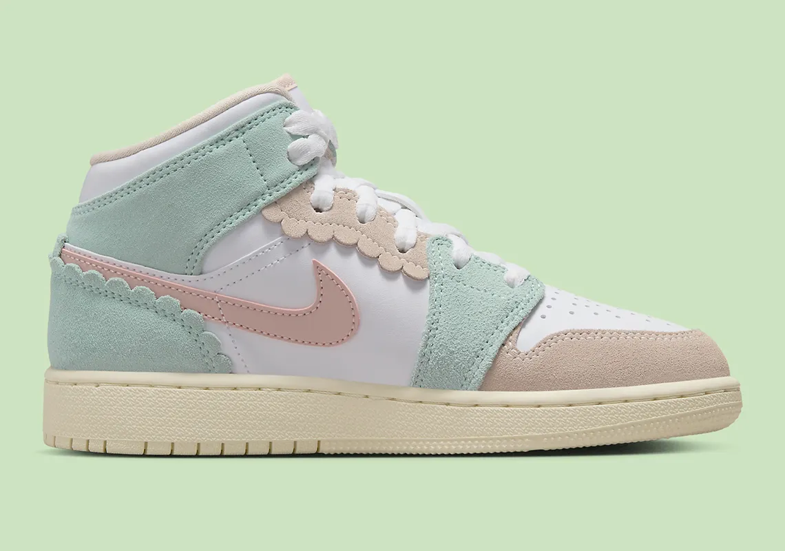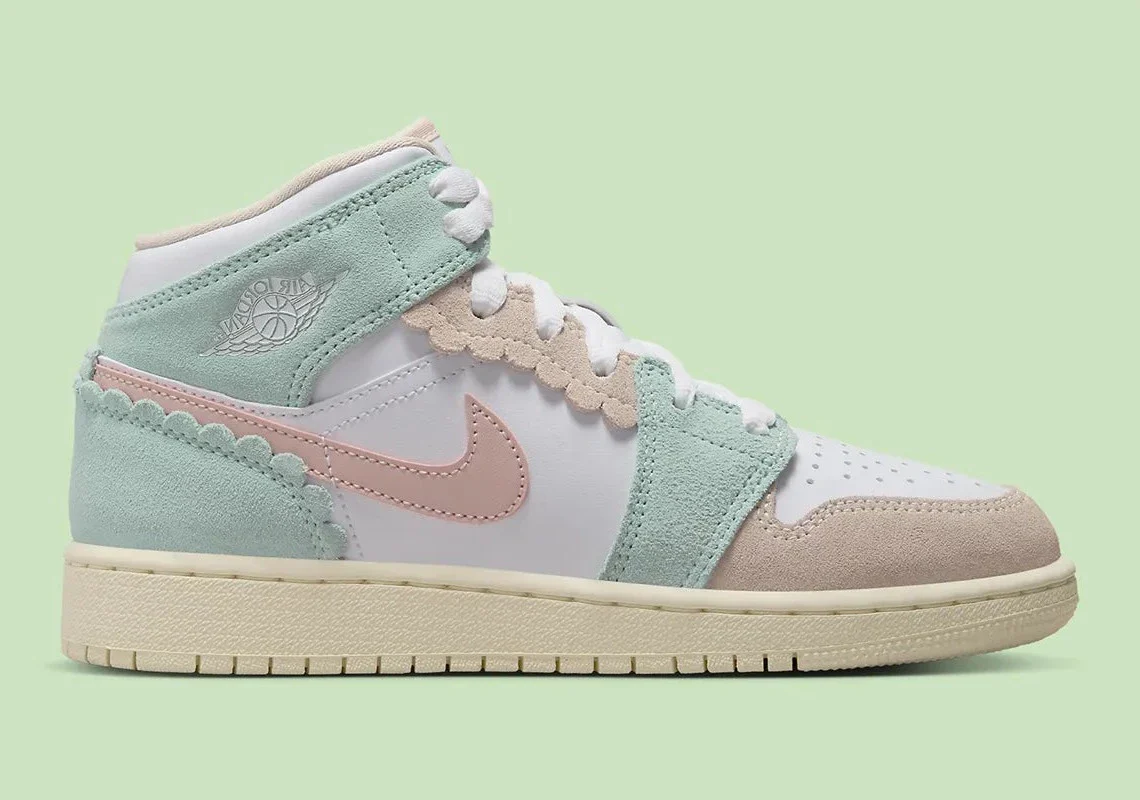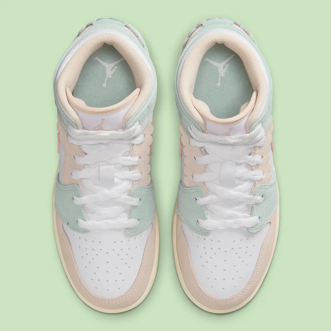 Cette Air Jordan 1 Mid est ludique non seulement en termes de couleurs mais aussi de construction, avec des bords festonnés au niveau du talon et des œillets. Bien que la coupe soit plus raffinée, le reste des empiècements est dans les mêmes tons bleu clair et rose, évoquant des images de Pâques. Le reste de la chaussure, à l’exception des semelles intermédiaires jaunies, est habillé d’une finition plus neutre, avec des tons blancs appliqués à l’unité de lacet ainsi qu’à la base en cuir. Elle rappellera au plus connaisseur d’entre vous la fameuse Jordan 1 Zoom Pink Oxford.