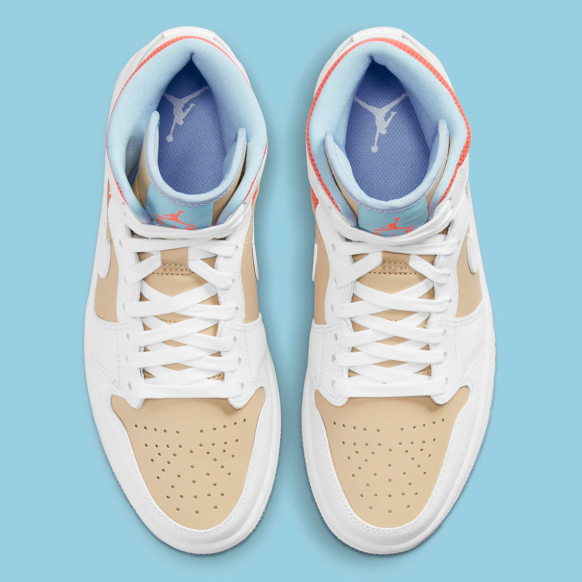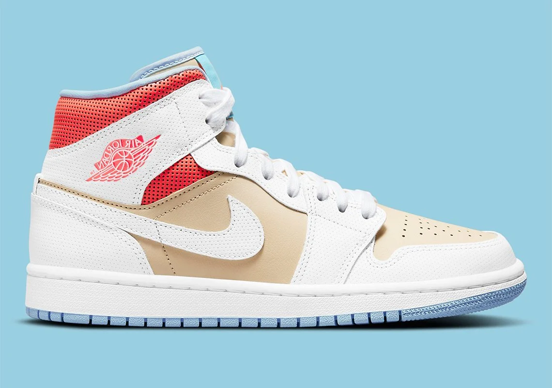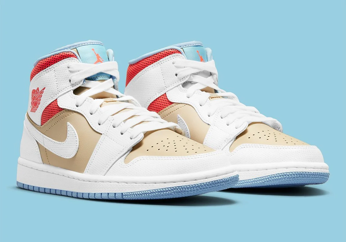 Ce mélange convivial de Sesame, Bright Crimson et Psychic Blue s’intègre parfaitement avec un accent blanc , frappant parfaitement cette esthétique de vêtements décontractés jusqu’à un tee-shirt. Au-delà du coloris, il y a l’utilisation de cuir perforé; une micro-perf est utilisée pour l’orteil, le talon, la superposition de dentelle et le Swoosh, tandis qu’une version beaucoup plus poreuse peut être vue sur le rembourrage de la cheville en dessous. Un cuir pleine fleur lisse est utilisé pour les portions de sésame pour compléter le look.