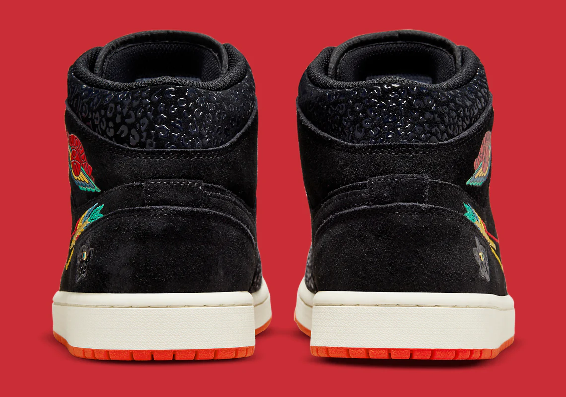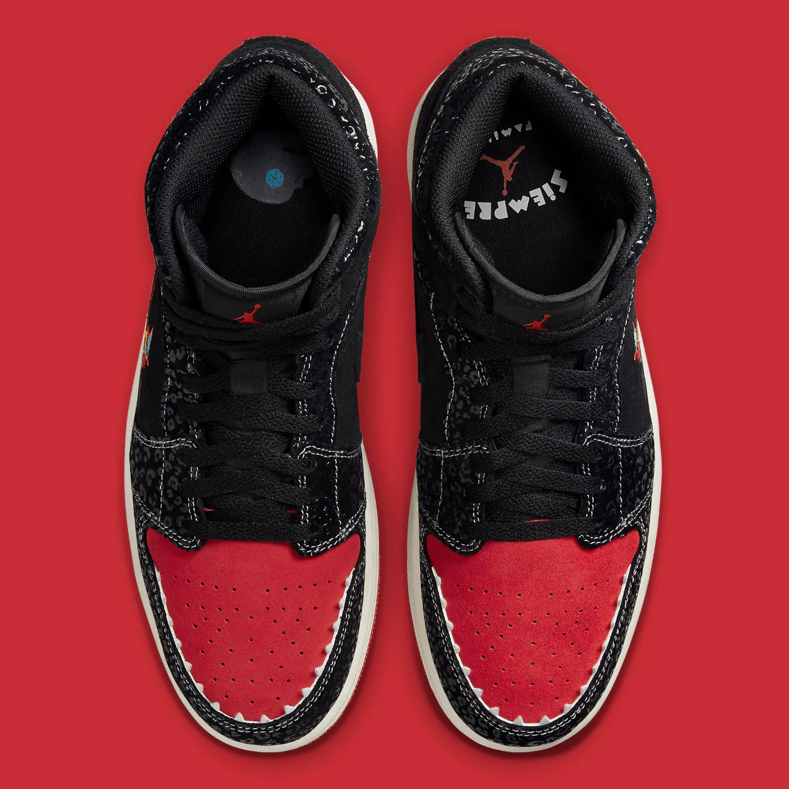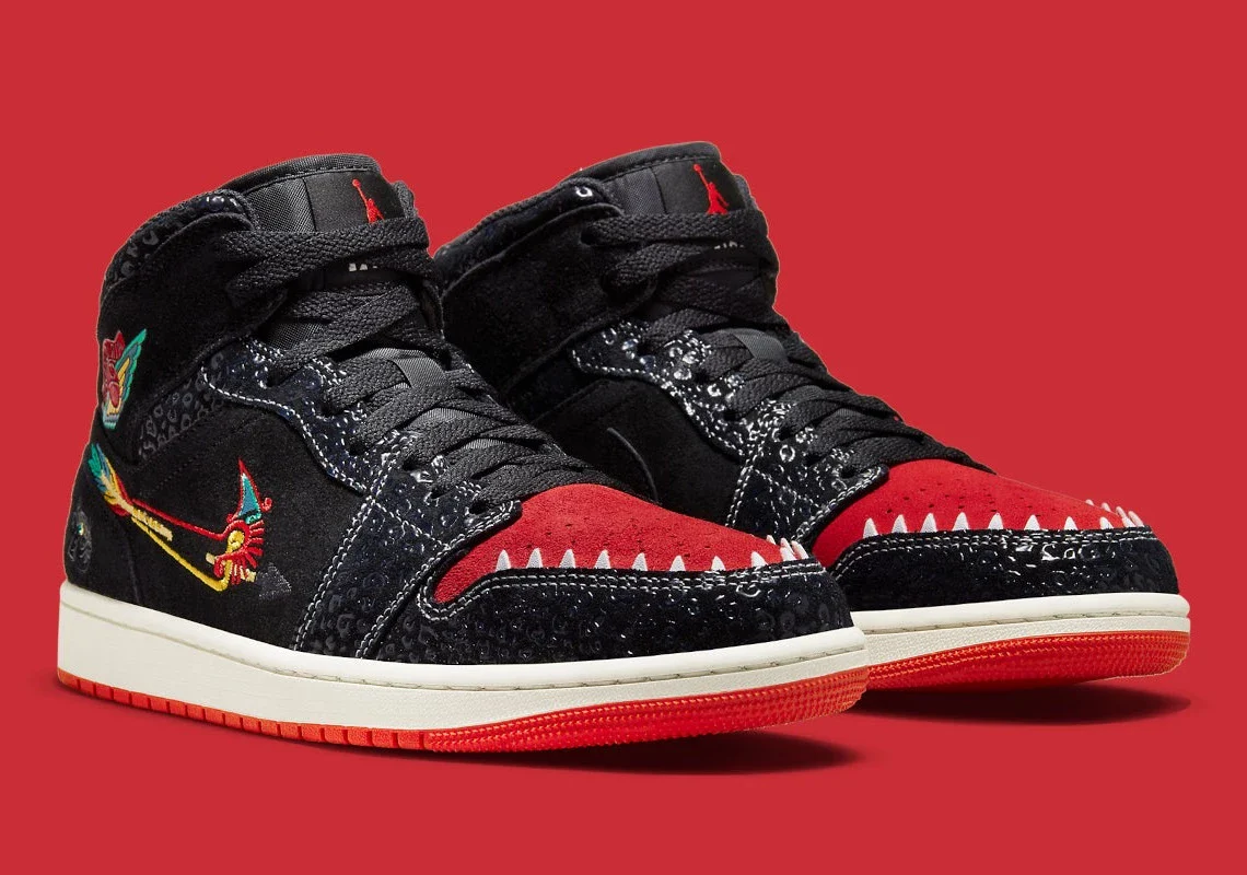 La Air Jordan 1 Mid SE « Siempre Familia » est une édition spéciale de la chaussure de basket classique publiée dans le cadre de la collection « Dia de los Muertos » de Nike, qui rend hommage à la fête traditionnelle mexicaine. Un look créatif pour la Air Jordan 1 Mid, la « Siempre Familia » est un coloris inspiré de Mictlán, le monde souterrain de la mythologie aztèque qui s’étend sur neuf niveaux. Les détails incluent des graphiques et des imprimés inspirés des animaux qui font référence à ceux qui nous conduisent dans l’au-delà. Le dessus de la chaussure est principalement noir avec des détails uniques tels que des superpositions texturées et un Swoosh modifié en forme d’arc et de flèche. Le logo « Wings » est conçu dans un look multicolore inspiré de « Dia de los Muertos ». Des dents inspirées du jaguar bordent la boîte à orteils perforée rouge.