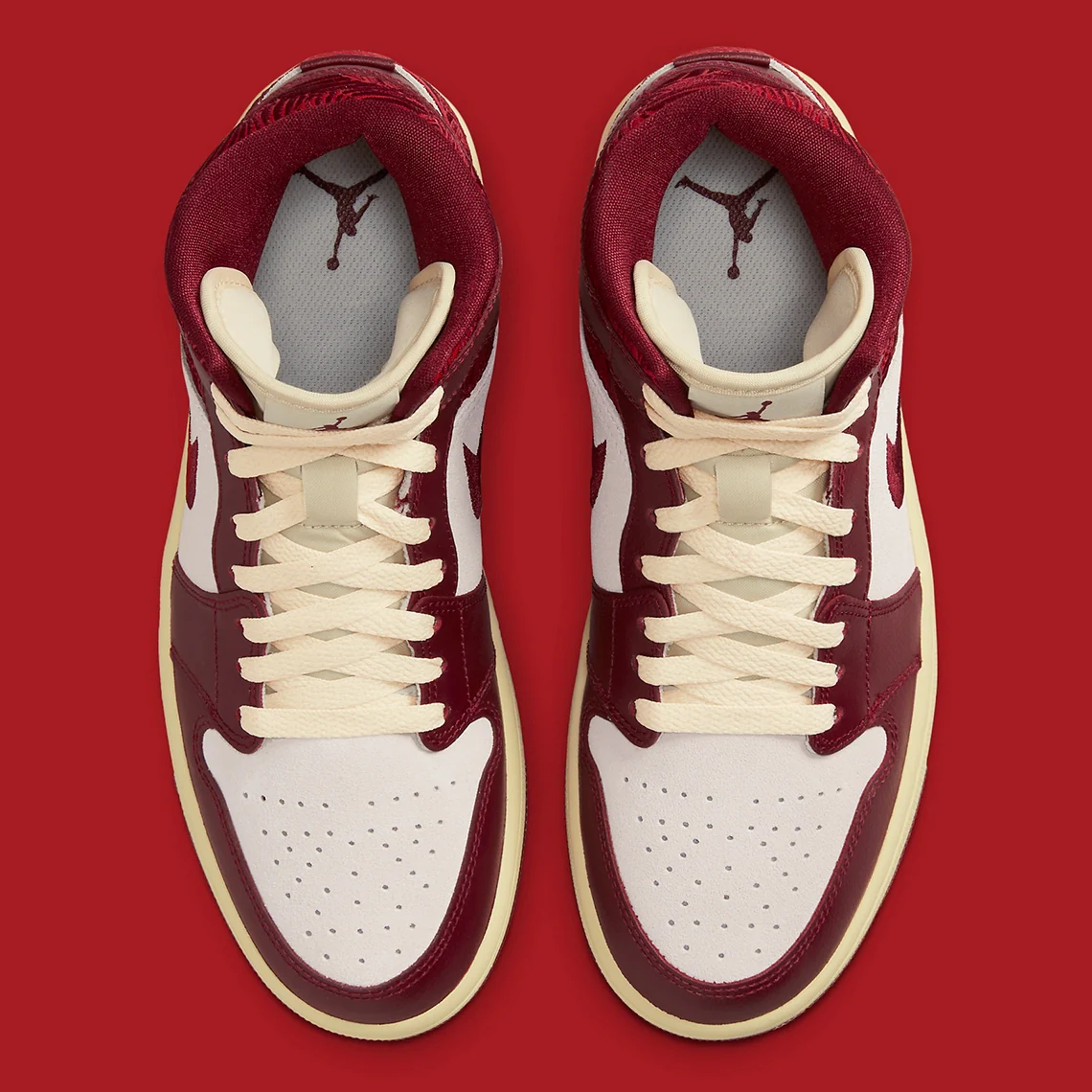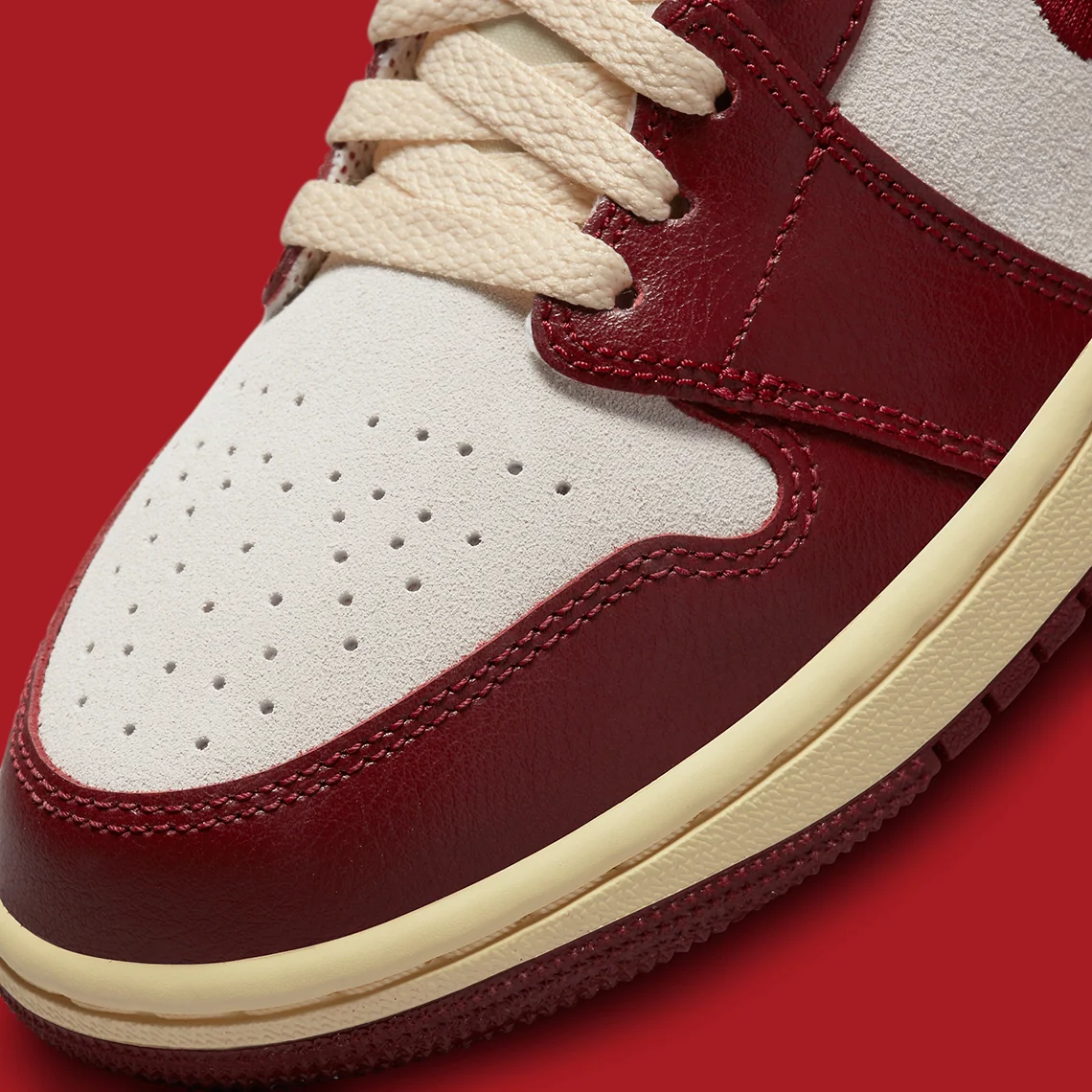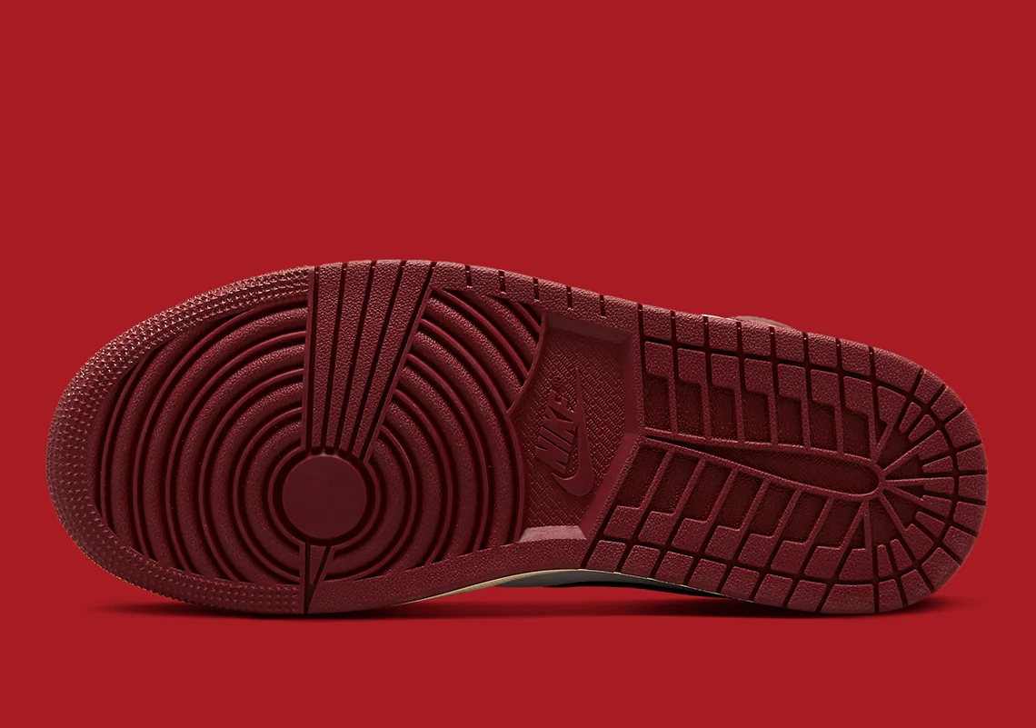 La construction en daim et en cuir apparaît de l’avant-pied au milieu du pied, les swooshes du profil abandonnant leur construction traditionnelle en faveur d’une construction cousue qui s’inscrit dans la lignée de certains maquillages de célébration de la marque. Enfin, les semelles intermédiaires adoptent une esthétique « vieillie » qui confère à la Air Jordan 1 moderne une touche vintage.