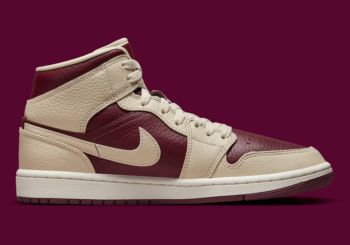 Jordan Brand a dévoilé une Air Jordan 1 Mid divisée en deux couleurs, qui présentait deux styles de blocage de couleurs différents sur ses côtés médial et latéral. Et bien qu’il ne se soit écoulé que quelques mois depuis l’apparition de ce colorway, le Jumpman le ramène déjà, cette fois-ci en remplaçant le noir et le blanc par « Beach » et « Cherrywood Red« . Hormis le changement de palette, le design est largement identique à son prédécesseur à dominante neutre. Les cuirs foulés constituent la majeure partie de la construction, qui présente une couture supplémentaire dans le sens de la longueur au centre de la chaussure. D’un côté, le « Cherrywood Red » prend la tête, recouvrant une base entièrement réalisée en « Beach ». Les ailes adjacentes font de même, tout comme la moitié de la languette. L’autre côté de l’étiquette est effectivement inversé, reflétant la coloration employée sur la partie médiane.