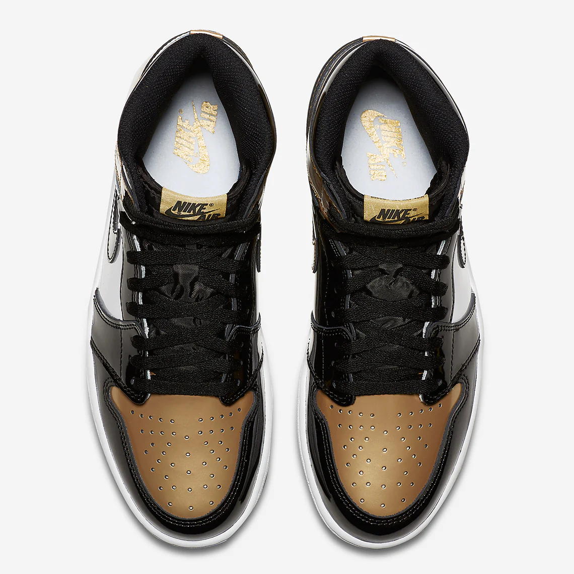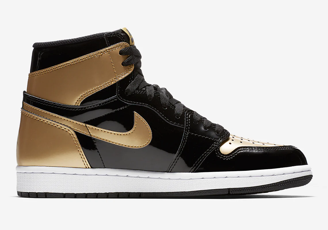 A ne pas confondre avec le « Top 3 Gold« , la Jordan 1 Retro High NRG Patent Gold Toe est sorti en 2018 dans une seconde combinaison de cuir verni blanc, noir et or pour les festivités du All-Star Weekend de la NBA.