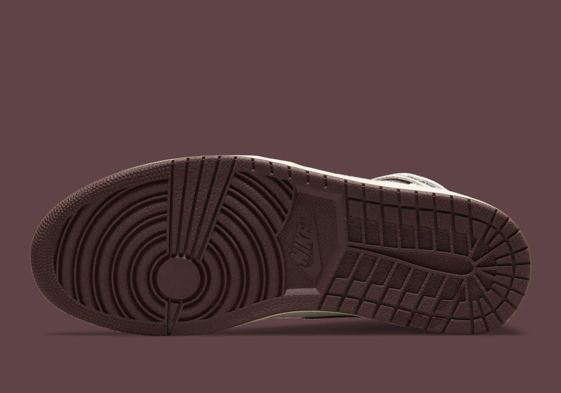 Le cuir lisse traditionnel est remplacé par du daim de haute qualité sur la plupart des tiges rétro « Sail » reprend tout, de la pointe à la languette et au talon, laissant les swooshes profilés et les empiècements du col pour se livrer à un ton contrasté « Burgundy Crush ». Ces composants diffèrent également dans la finition de leur matériau, car ils présentent une finition en peau de serpent accrocheuse. Les lacets et le texte « NIKE AIR » sur l’ étiquette de la languette des Jordans renoncent à tout arrangement d’inspiration reptilienne, mais optent pour la même teinte vineuse ; la doublure intérieure emboîte le pas, tout en revêtant une construction en satin matelassé semblable à la collaboration susmentionnée d’A Ma Maniére.