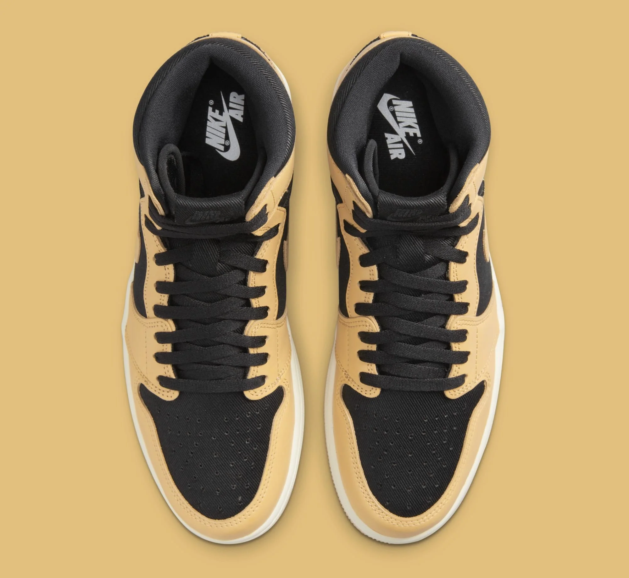 En commençant par la partie supérieure, l’AJ1 High Heirloom est recouverte de cuir vachetta tan supérieur avec des sous-couches en toile noire, partageant une combinaison de couleurs similaire à celle des Jordan 1 « Shadow 2.0 » et « Dark Marina Blue ». Pour ajouter du contraste, une semelle intermédiaire en caoutchouc blanc est associée à une semelle extérieure marron. Jordan adopte une approche légèrement différente avec le marquage de la basket en reportant le cuir vanchetta sur le logo « Wings » qui orne la tige et une étiquette « Nike Air » en toile qui se trouve au sommet de la languette de la basket.