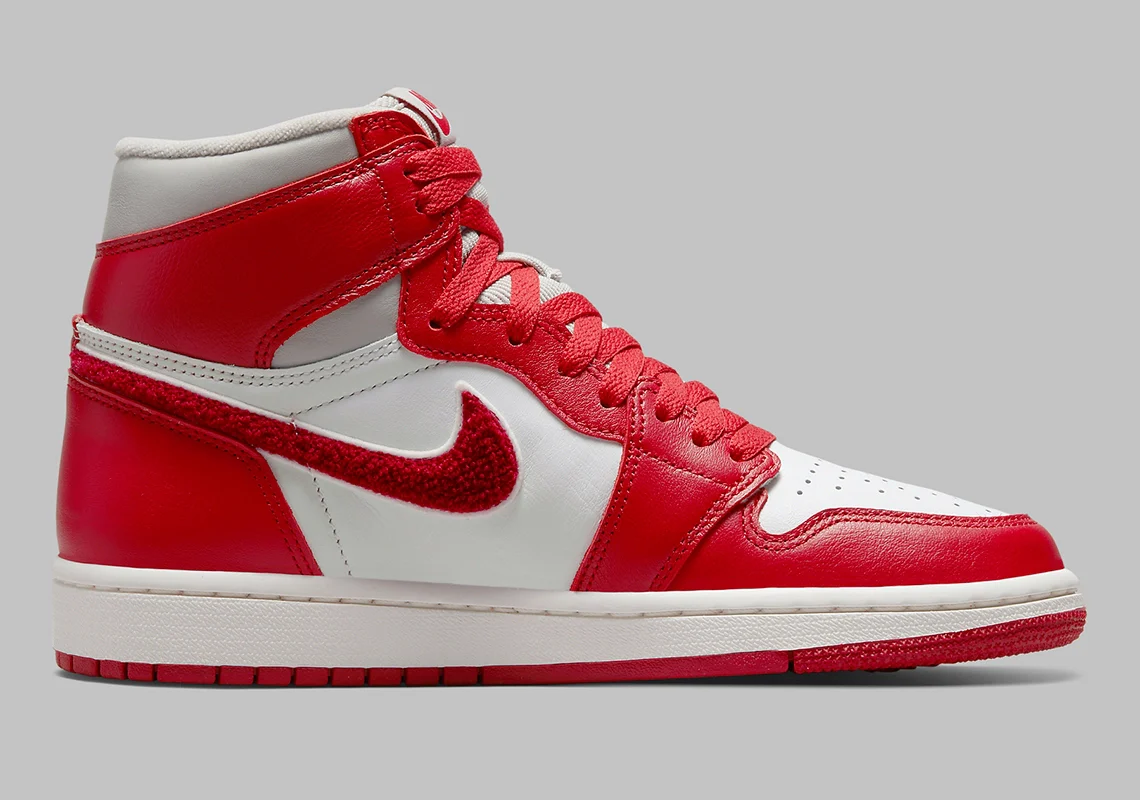 Cette version de cette rétro est une déclinaison collégiale du modèle original de Michael Jordan, avec une combinaison de rouge et de « Light Iron Ore« , ce dernier ton recouvrant les panneaux de col en cuir lisse. « Le blanc recouvre la majeure partie du reste de la construction, mais il est éclipsé par le tissu Chenille qui compose les swooshes du profil à la manière des vestes universitaires. Les accroches « NIKE AIR » incluses présentent également le matériau duveteux, élargissant encore le catalogue de design de la Air Jordan 1. De plus, le rétro trois tons est prévu pour apparaître dans les tailles Preschool et Toddler, permettant ainsi aux plus petits amateurs de sneakers de profiter de cet ensemble rafraîchissant.