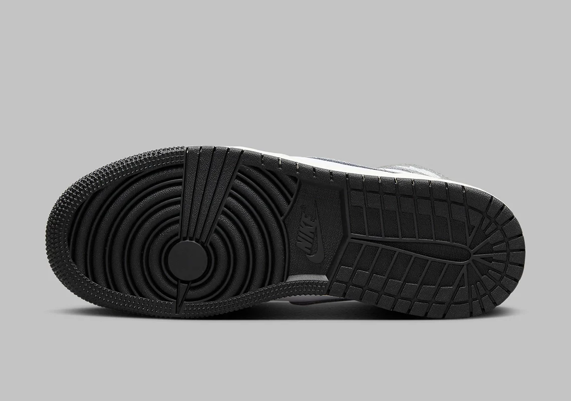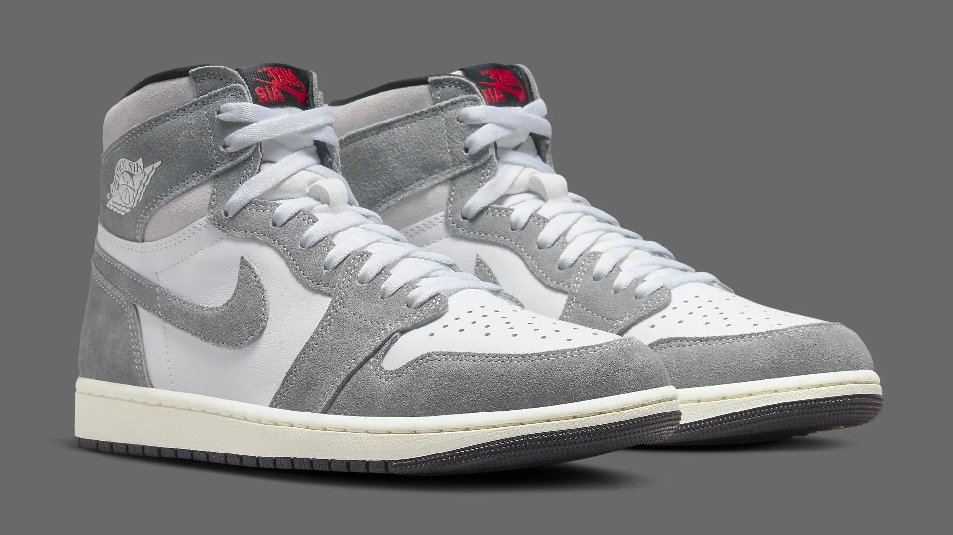 La teinte grise est contrastée par des couches de base entièrement blanches, ainsi que par une couleur gris clair au niveau des cols. Un rouge vif vient s’ajouter à l’ensemble grâce au traditionnel marquage « NIKE AIR » sur la languette. Sous le pied, la semelle, souvent imitée, est blanc cassé, ce qui contribue à l’esthétique « vintage » de la Jordan 1 ; la semelle extérieure opte pour une finition noire qui a fait ses preuves.