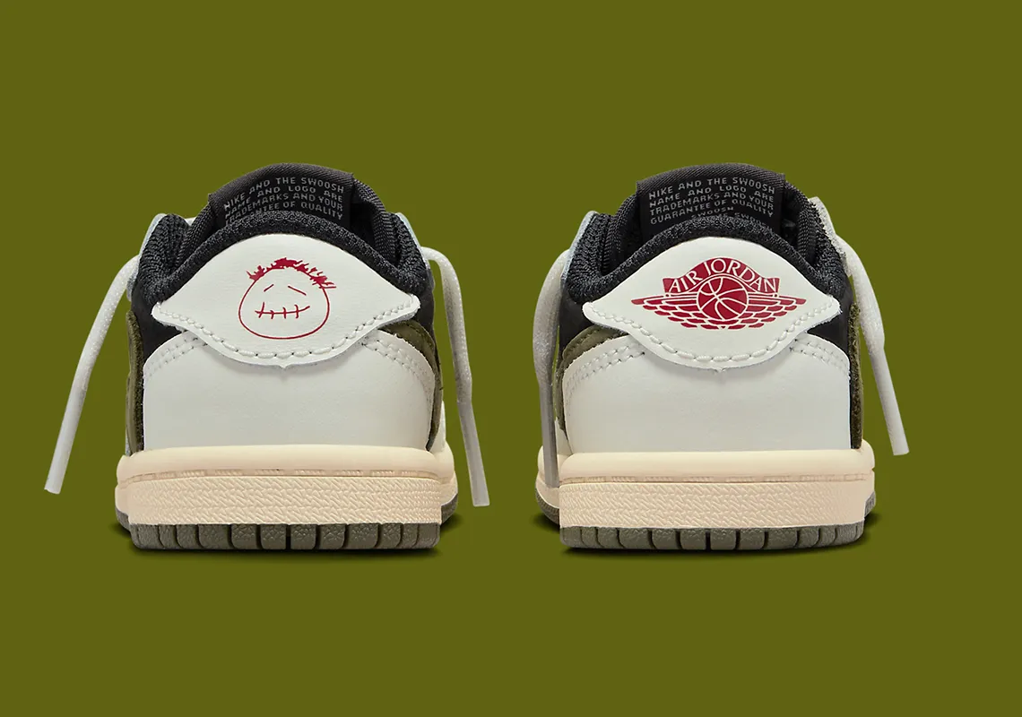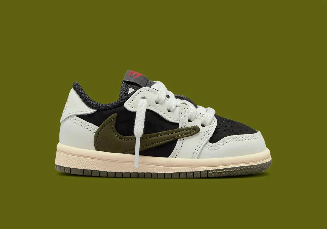 La Jordan 1 Retro Low OG SP Travis Scott Olive (TD) reprend l’esthétique emblématique de la collaboration dans une version spécialement pensée pour les tout-petits, mêlant style premium et confort adapté aux premiers pas. La tige combine un cuir lisse blanc cassé à des empiècements en suede noir, créant un contraste affirmé et fidèle à la version adulte. Le célèbre Swoosh inversé, décliné ici dans une teinte Olive profonde, apporte la signature visuelle incontournable de Travis Scott, tandis que les touches de rouge sur les logos Cactus Jack viennent ponctuer la silhouette d’un détail co-brandé immédiatement reconnaissable. La construction TD privilégie la souplesse et la stabilité grâce à une semelle légère, une mousse douce et un col rembourré qui assurent un maintien sécurisé et confortable pour les plus petits. L’ensemble offre une sneaker miniature stylée, qualitative et expressive, parfaite pour initier les enfants aux collaborations cultes entre Jordan Brand et La Flame.