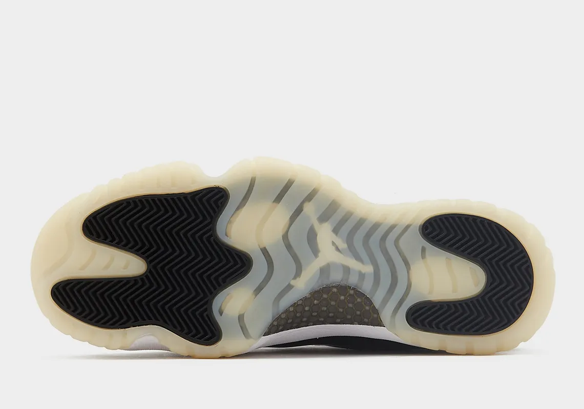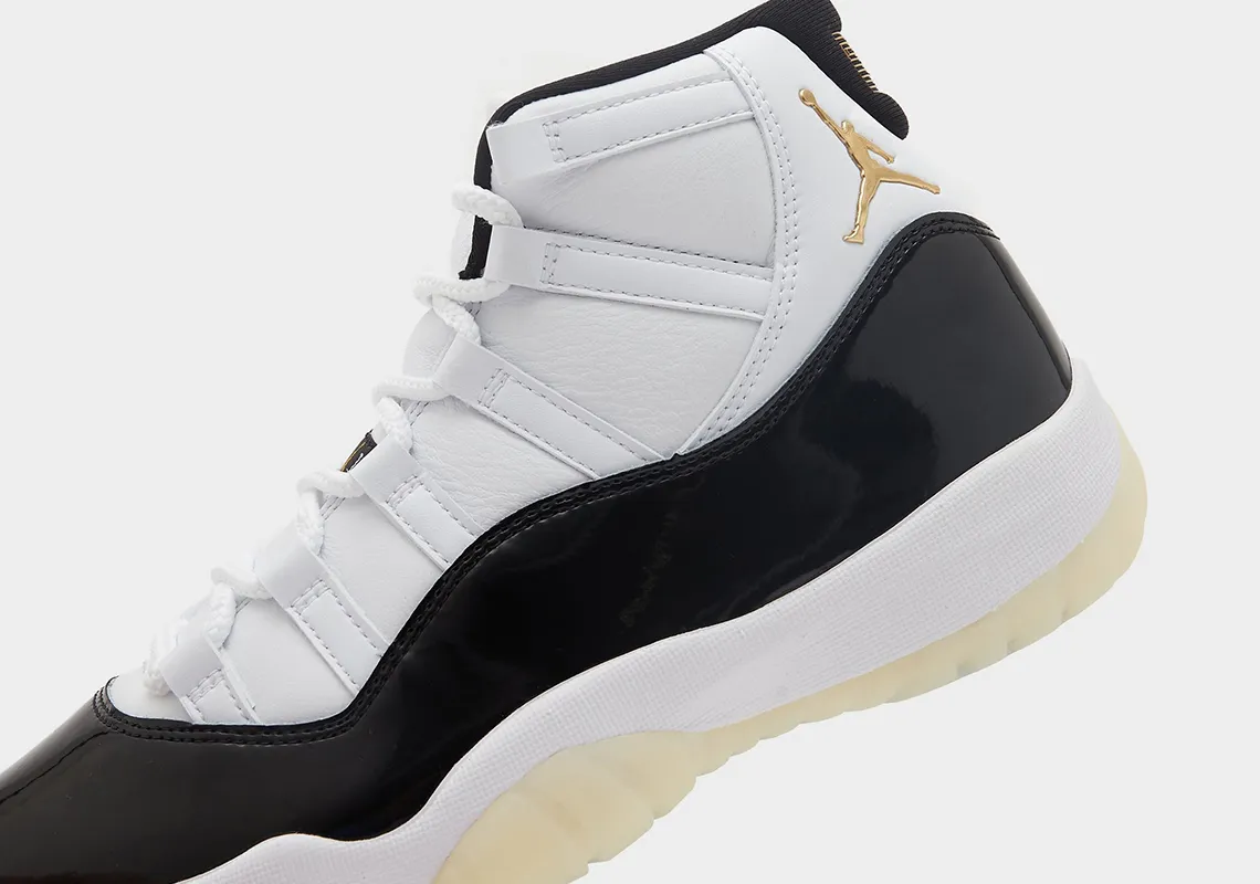 Bien qu’elle ressemble beaucoup à celle de son prédécesseur bien-aimé, le design de la Air Jordan 11 « Gratitude » 2023 présente un détail clé différent de l’original. Au lieu du mesh, les blancs de la construction sont entièrement fabriqués à partir d’un cuir foulonné, donnant à la tige une sensation plus robuste et haut de gamme. De plus, la semelle extérieure a été traitée avec une finition légèrement jaunie. Le reste de la chaussure, cependant, est beaucoup plus fidèle au matériau d’origine, doté d’un garde-boue en cuir verni noir ainsi que d’un logo doré.