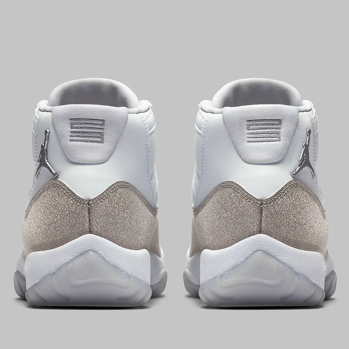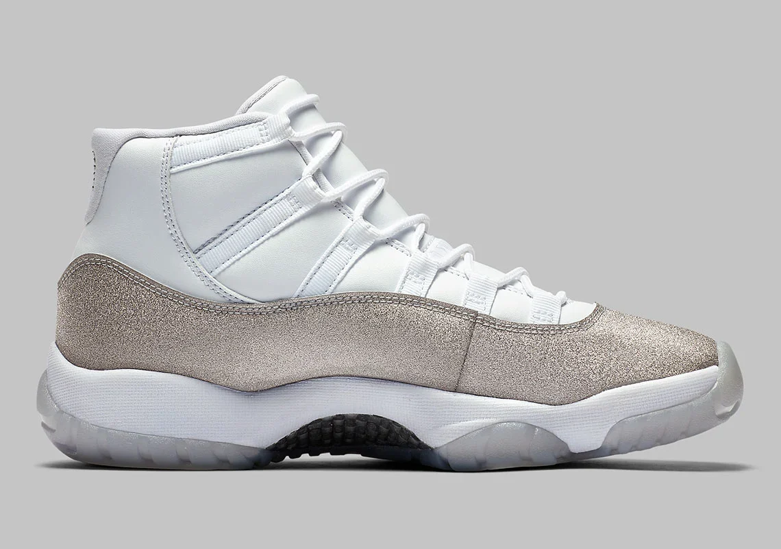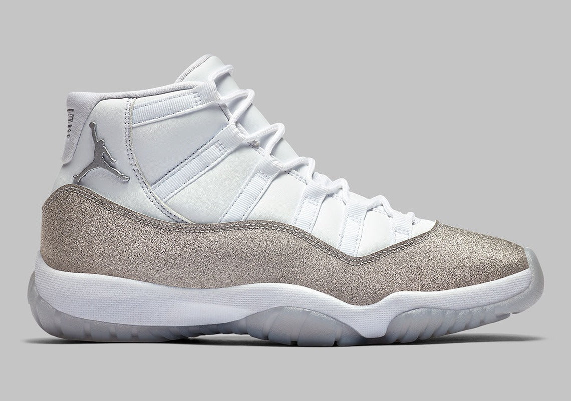 Du nylon balistique blanc sur les œillets et le col complète la tige au style minimaliste. Une semelle intermédiaire blanche, une plaque en fibre de carbone et une semelle extérieure semi-translucide avec un Jumpman blanc complètent le look. La Air Jordan 11 « Metallic Silver ».