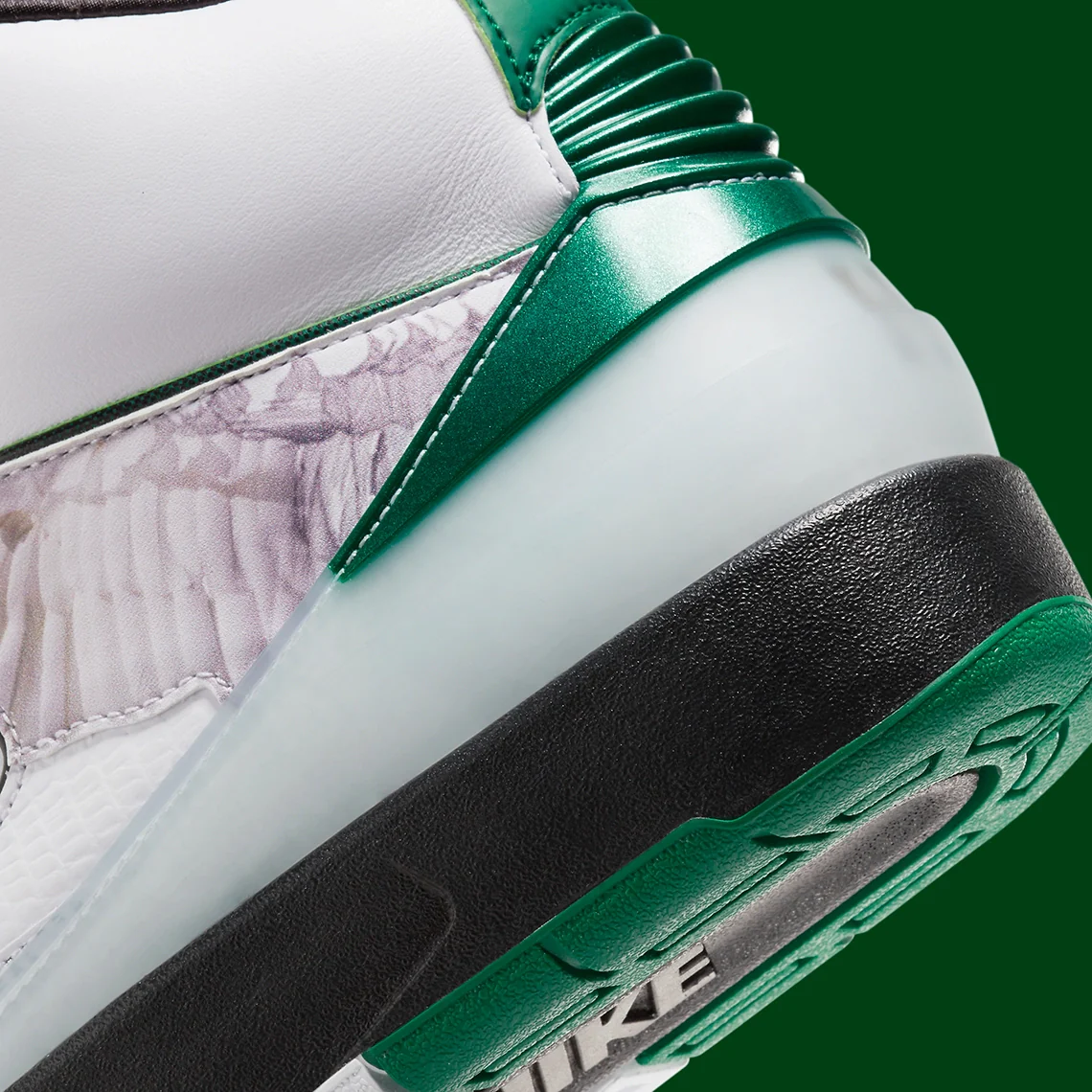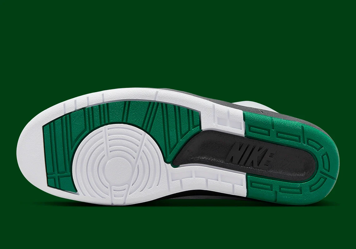 La sneaker assure un amorti léger et un soutien grâce à sa semelle intermédiaire en PU noir, équipée d’une unité de semelle Air encapsulée. La languette arrière de la marque Nike et le logo rétro Wings sur la languette apparaissent en vert contrasté. Pour commémorer les contributions d’Howard White, la lettre « H » est mise en évidence sur la semelle intérieure et se trouve également sous le contrefort du talon semi-translucide.