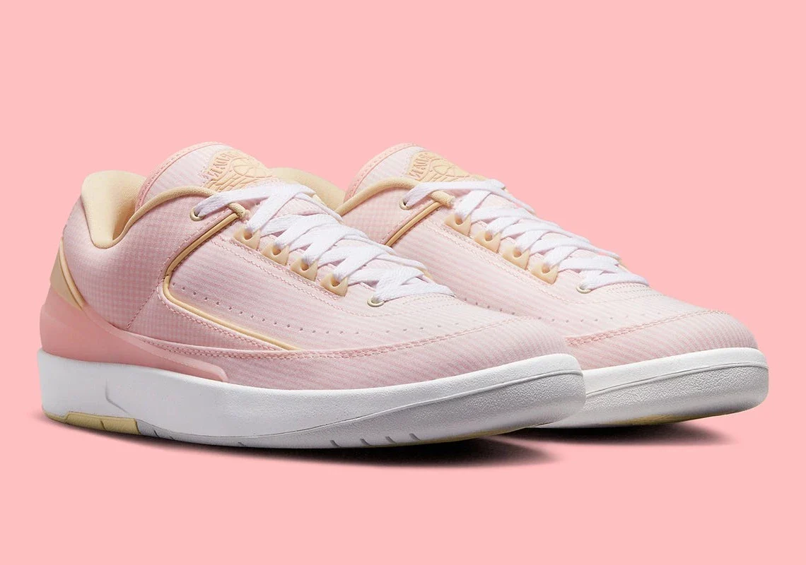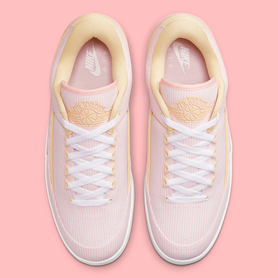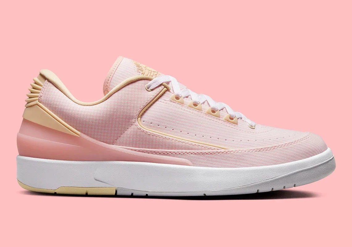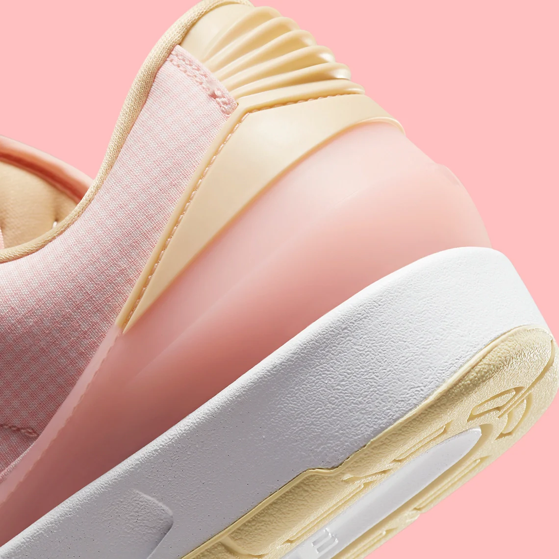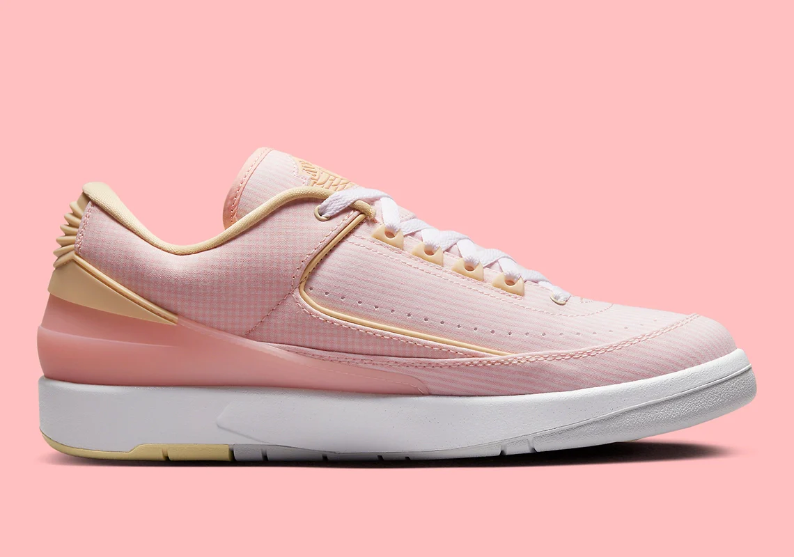 La Air Jordan 2 Retro Low ‘Craft Atmosphère’ donne à la deuxième chaussure emblématique de Michael Jordan un look parfait pour l’été. Le cuir typique de cette low-top est remplacé par une tige en textile rayé dans un éventail de teintes roses. La chaussure présente des touches de vanille pâle sur la languette moulée du talon, les œillets TPU et le passepoil du milieu du pied. Le sockliner porte la marque classique Nike Air tandis que la languette arbore un logo Wings vintage. La semelle intermédiaire en polyuréthane blanc apporte du soutien au pied et est soutenue par une semelle extérieure en caoutchouc bicolore gris et jaune.