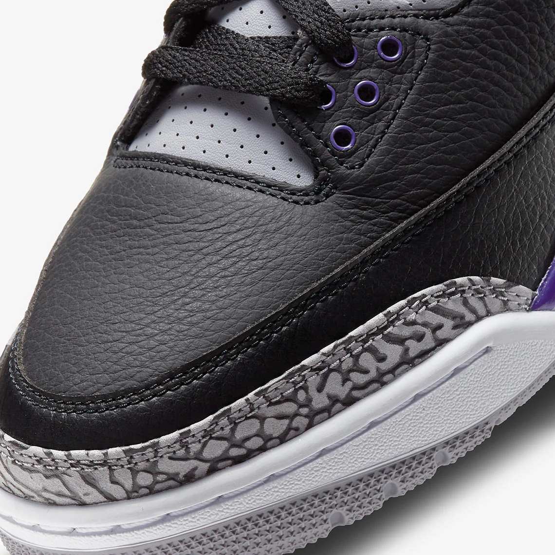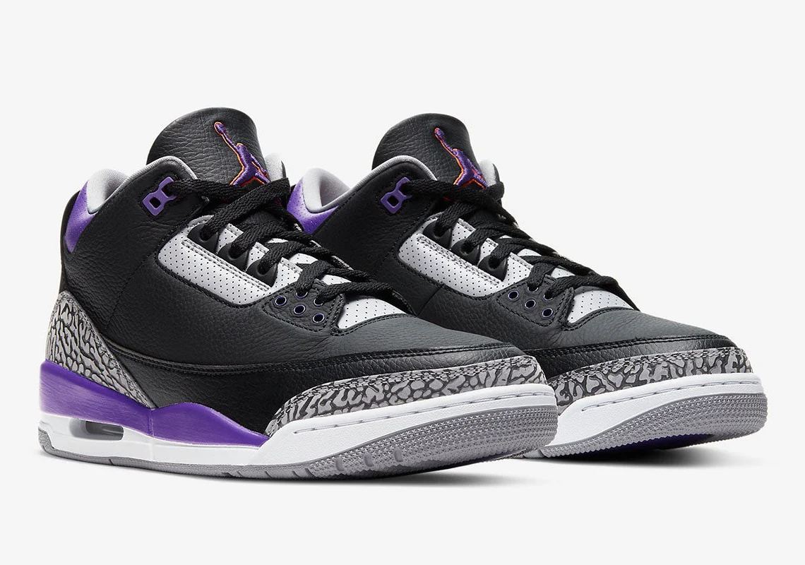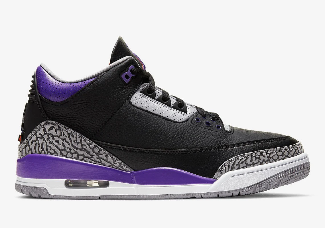 La Air Jordan 3 « Court Purple » est un clin d’œil officieux aux Phoenix Suns puisque le colorway apparaît habillé des couleurs de l’uniforme de l’équipe. Le design « Court Purple » de la troisième chaussure signature de Michael Jordan, qui fait partie des sorties Holiday 2020 de Jordan Brand, présente une tige en cuir tumbled noir avec des accents en cuir violet sur le col et sur les œillets en plastique. L’imprimé éléphant classique du modèle apparaît sur le garde-boue et le bout de la chaussure. Ailleurs, l’orange borde le Jumpman brodé Court Purple cousu sur la languette en cuir noir et un Jumpman synthétique violet apparaît à l’arrière de la chaussure au-dessus du marquage « AIR » orange.