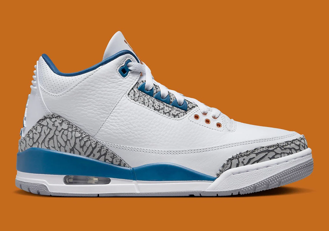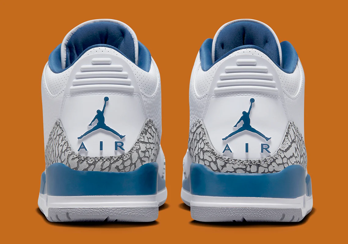 Son design est un hommage direct aux couleurs de l’équipe de basket de Washington de 1997 à 2007. Et bien qu’elle soit différente à certains égards (comme le détail « Metallic Copper » le long des œillets et du logo Jumpman) beaucoup ont comparé la paire à la 3s « True Blue ». Cette comparaison n’est pas sans fondement, car la 2023 Retro ressemble étrangement à la version OG. En plus d’incorporer le même ton cool, le colorway présente une construction en cuir tumbled blanc et l’emblématique Elephant Print.