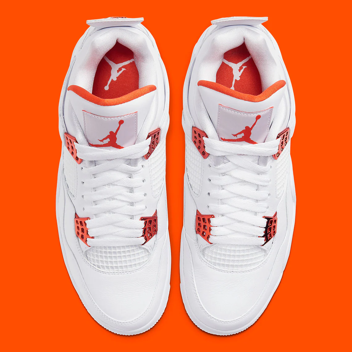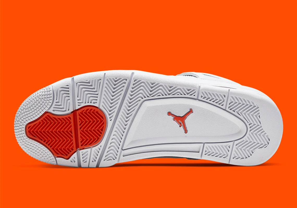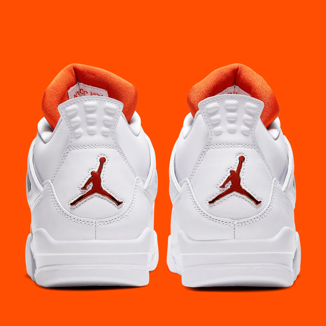 L’aspect bicolore se caractérise par une tige en cuir blanc avec un filet ton sur ton sur le milieu du panneau et la gorge. Des touches d’orange métallique sur les œillets de lacet et des détails Jumpman sur le talon offrent un contraste saisissant avec la base neutre. D’autres marques Jumpman orange se trouvent sur la languette en nylon. La teinte apparaît également sur la doublure intérieure de la langue. L’apparence classique de l’Air Jordan 4 de ce design « Metallic Orange » comprend une petite fenêtre d’air visible dans le talon.