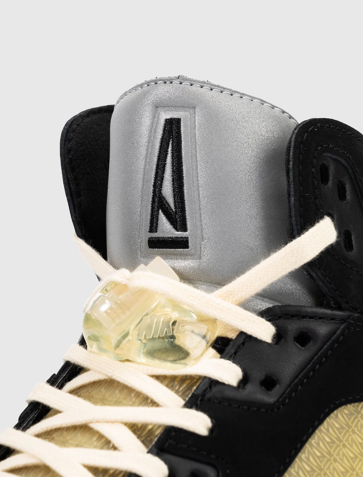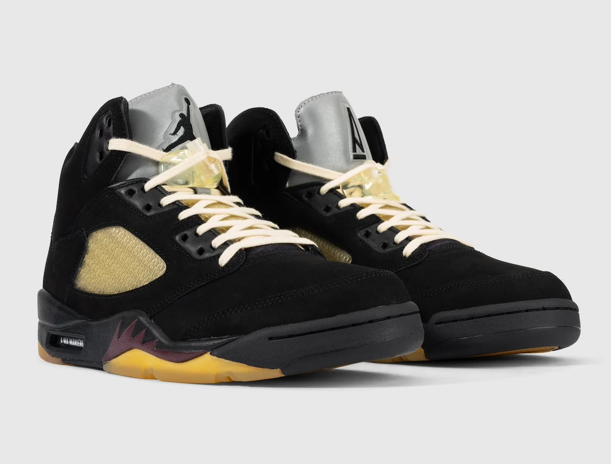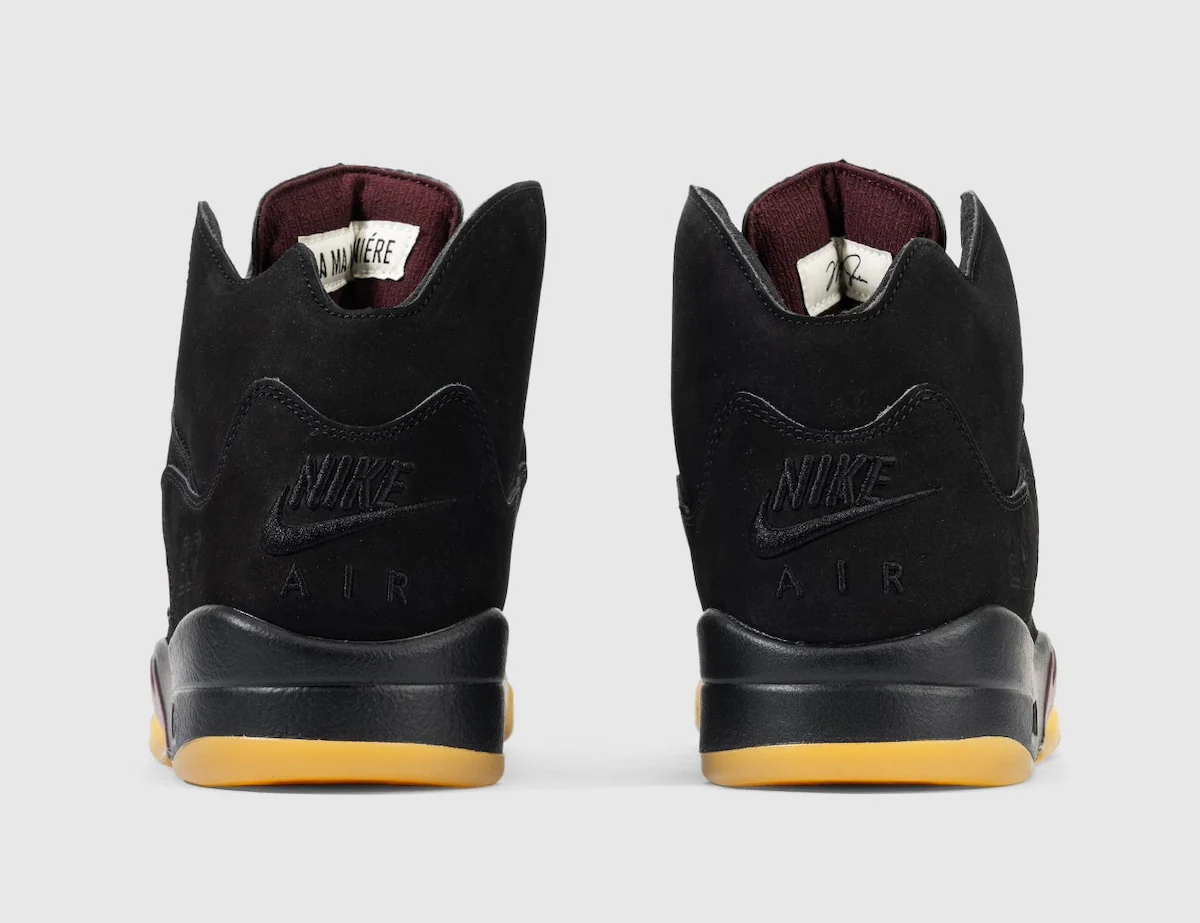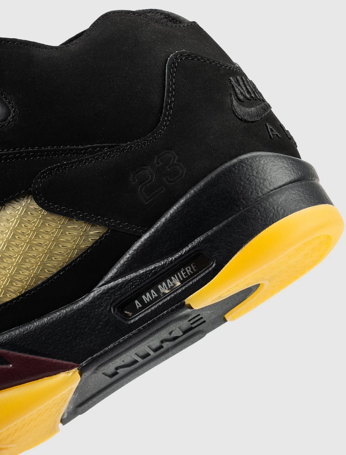 Habillée d’un nubuck premium gris anthracite, cette paire allie sophistication et authenticité. On retrouve les codes originaux de la Jordan 5 (la languette réfléchissante 3M, les panneaux en mesh et les fameuses dents de requin sur la semelle intermédiaire) sublimés par une finition sobre et élégante. Le branding A Ma Maniére vient signer la paire de manière discrète mais impactante.
