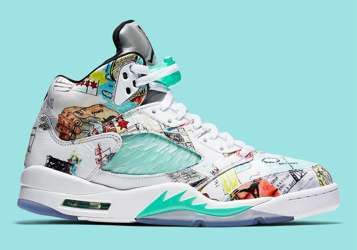 À l’instar de son prédécesseur « Cool Grey » de 2013, la prochaine Jordan 5 « Bel-Air » arbore plusieurs accents multicolores dans sa construction standard. Les couleurs « Racer Pink« , « Court Purple » et « Ghost Green » envahissent le col et la languette dans la plus pure tradition des années 90. Le vert vif anime également le marquage de la languette noire de la chaussure gauche et du talon médial et de la colonne vertébrale « White » ; le marquage de la chaussure droite adopte le ton « Racer Pink ». Les autres composants de l’empeigne sont plus discrets, avec des superpositions en cuir recouvertes de « White » tandis que les fenêtres en mesh ont une finition claire. Sous le pied, cependant, cette Jordan 5 retro est plus bruyante avec des outils chargés de riches teintes violettes, vertes et roses.