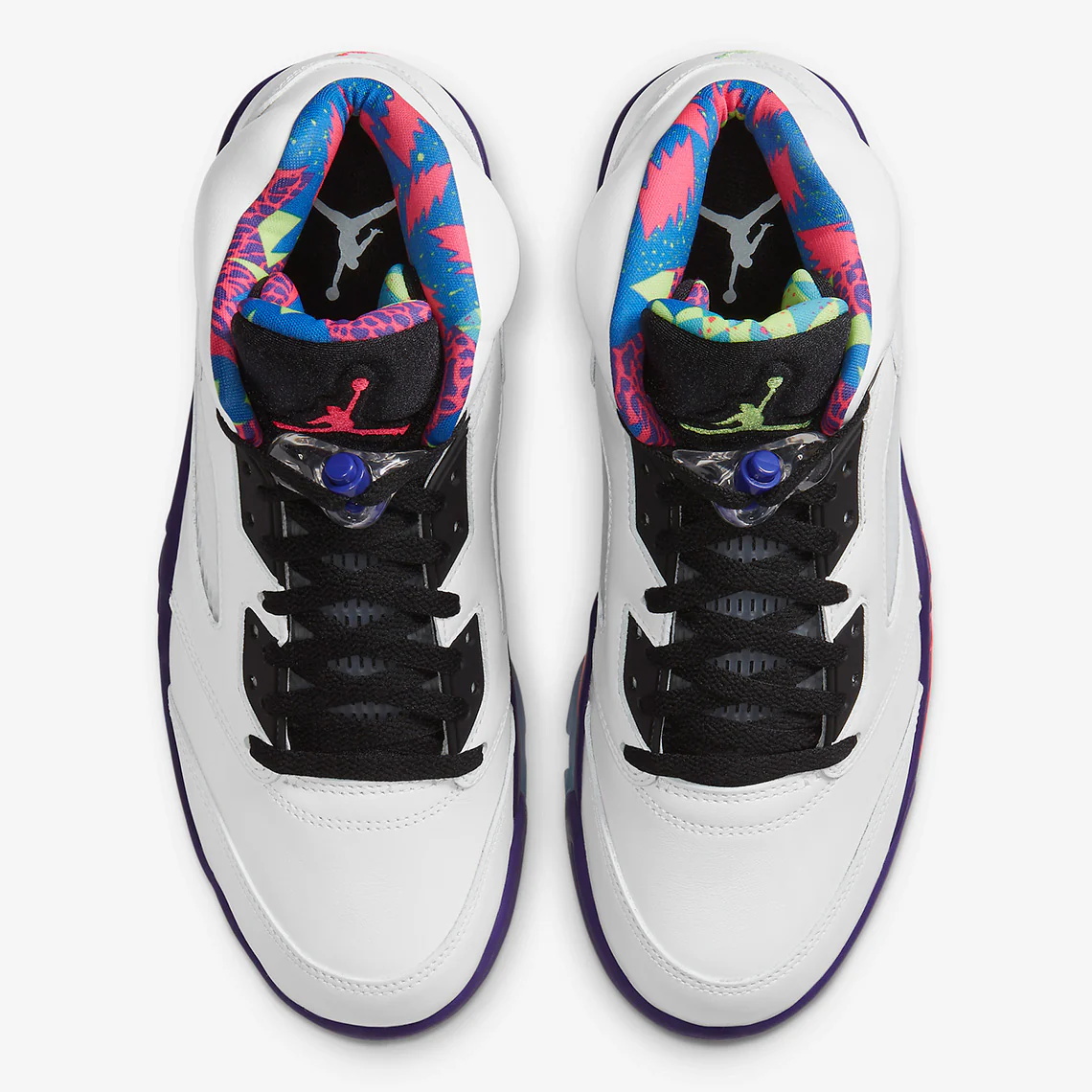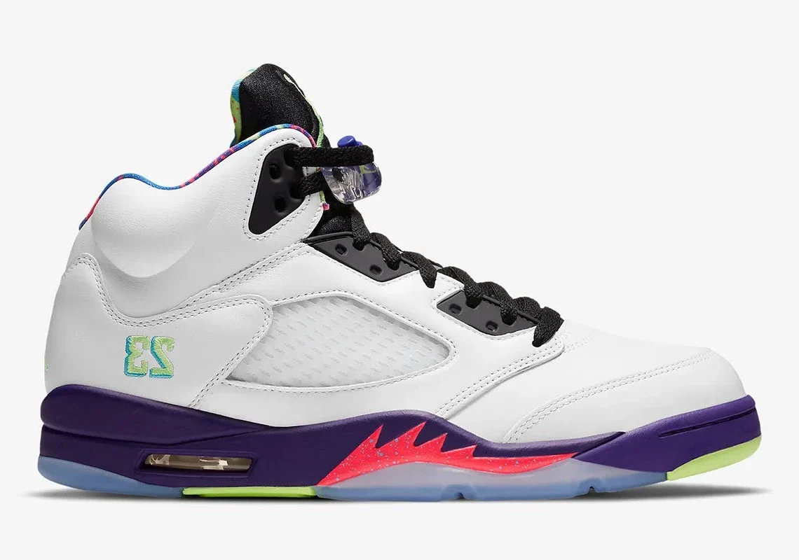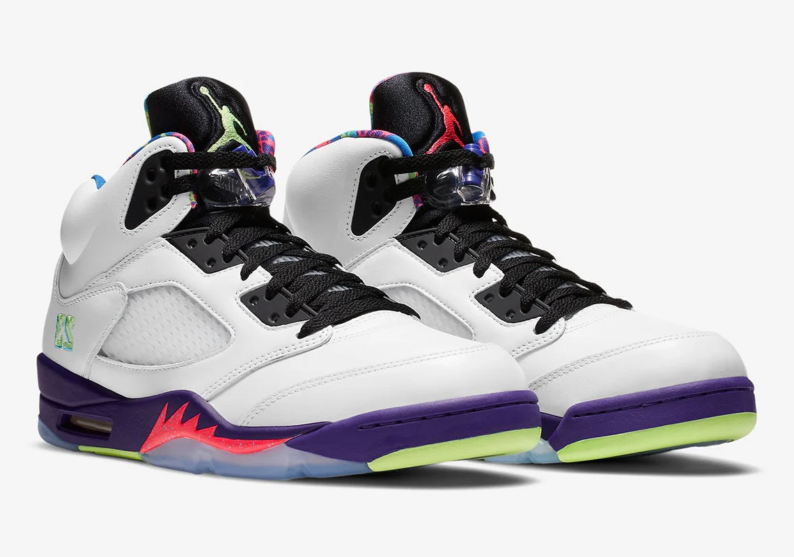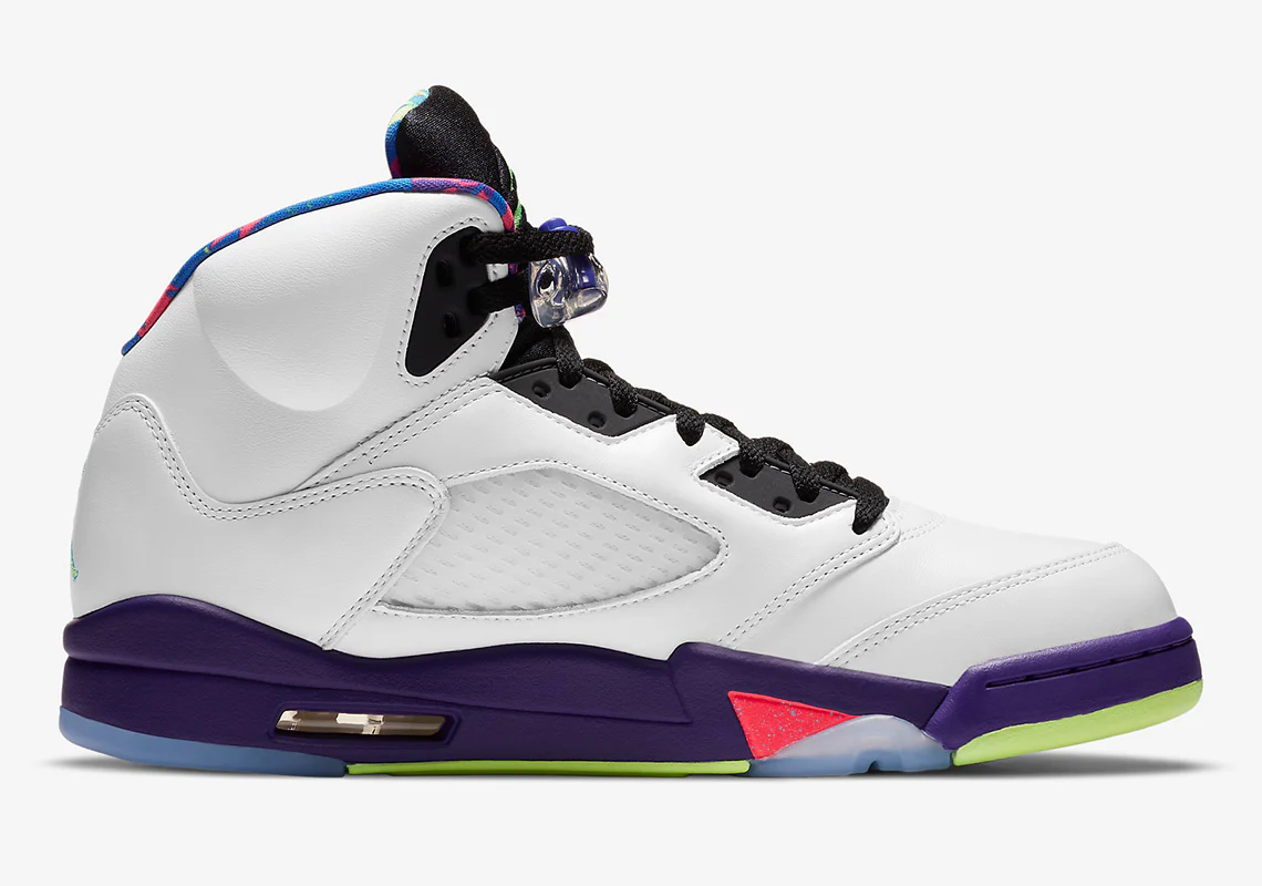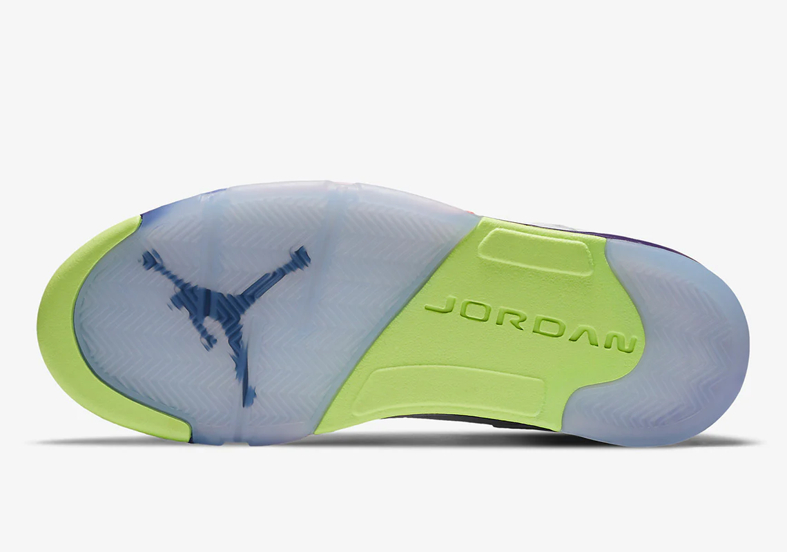 À l’instar de son prédécesseur « Cool Grey » de 2013, la prochaine Jordan 5 « Bel-Air » arbore plusieurs accents multicolores dans sa construction standard. Les couleurs « Racer Pink« , « Court Purple » et « Ghost Green » envahissent le col et la languette dans la plus pure tradition des années 90. Le vert vif anime également le marquage de la languette noire de la chaussure gauche et du talon médial et de la colonne vertébrale « White » ; le marquage de la chaussure droite adopte le ton « Racer Pink ». Les autres composants de l’empeigne sont plus discrets, avec des superpositions en cuir recouvertes de « White » tandis que les fenêtres en mesh ont une finition claire. Sous le pied, cependant, cette Jordan 5 retro est plus bruyante avec des outils chargés de riches teintes violettes, vertes et roses.