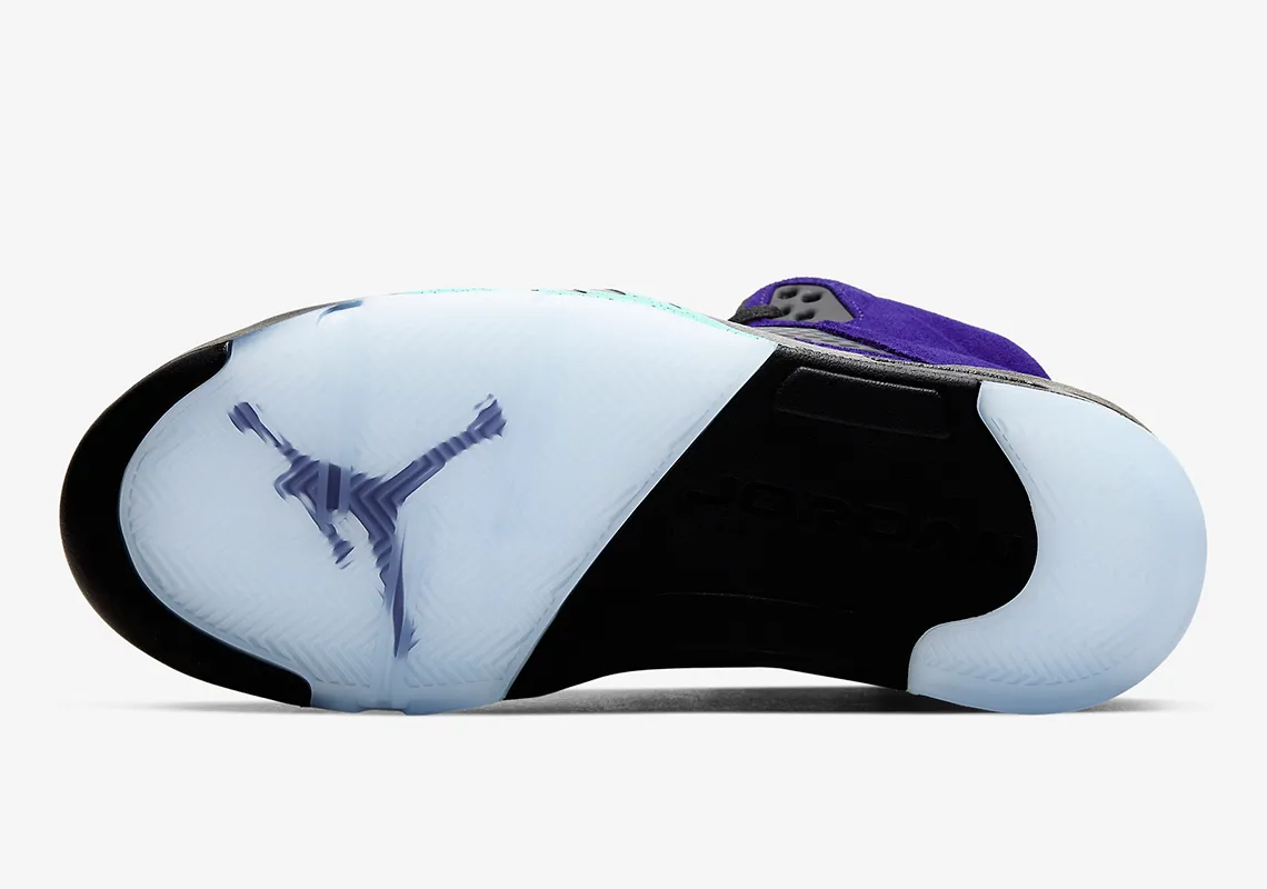 Habillée de « Grape Ice« , la prochaine Jordan 5 retro est la plus audacieuse des suites de 1990. Principalement composée de daim, l’empeigne de la paire est contrastée par des accents de matériaux mixtes « Black » sur la gorge, le milieu du pied et le col. Les talons latéraux sont dépourvus de tout texte « 23 » ; les logos Jumpman sur la colonne vertébrale restent subtils et non OG. La mention « New Emerald » sur la languette, les lacets et les détails de la semelle intermédiaire, en revanche, rappelle la muse de cette Jordan 5, vieille de 30 ans. Contrairement à la Jordan 5 en blanc cassé, la semelle extérieure présente un arrangement glacé qui jaunira avec l’usure.