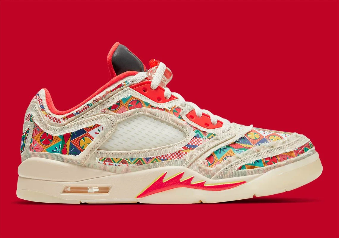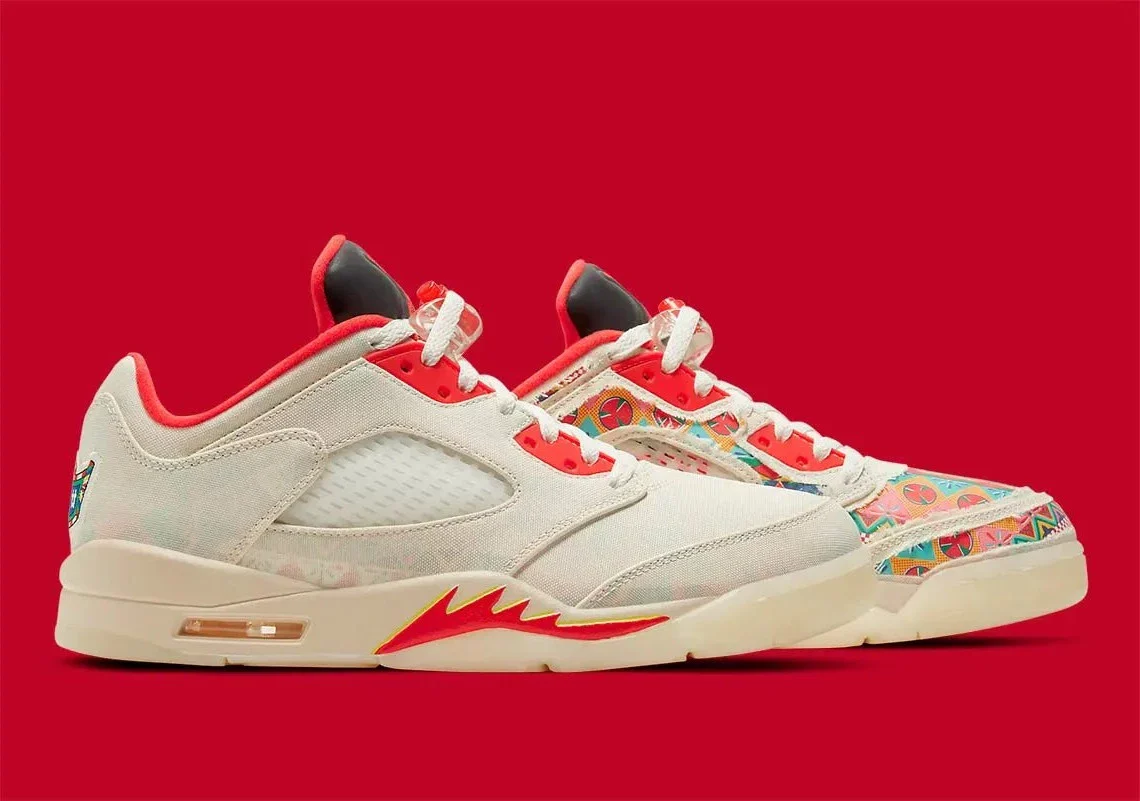 Présentée demain, la Jordan 5 Low CNY est plutôt trompeuse quant à son inspiration centrale. Au départ, l’extérieur présente une toile blanche, presque crème clair, une couche assez fine pour révéler subtilement l’art qui se trouve juste en dessous. À côté, les œillets, la fermeture du lacet, la languette, la doublure et la semelle intermédiaire sont ornés d’accents rouges de bon augure, assortis à une partie de l’insigne cousu sur le contrefort. Une fois que la paire aura été mise à l’épreuve, vous pourrez admirer le spectacle inspiré des pétards.