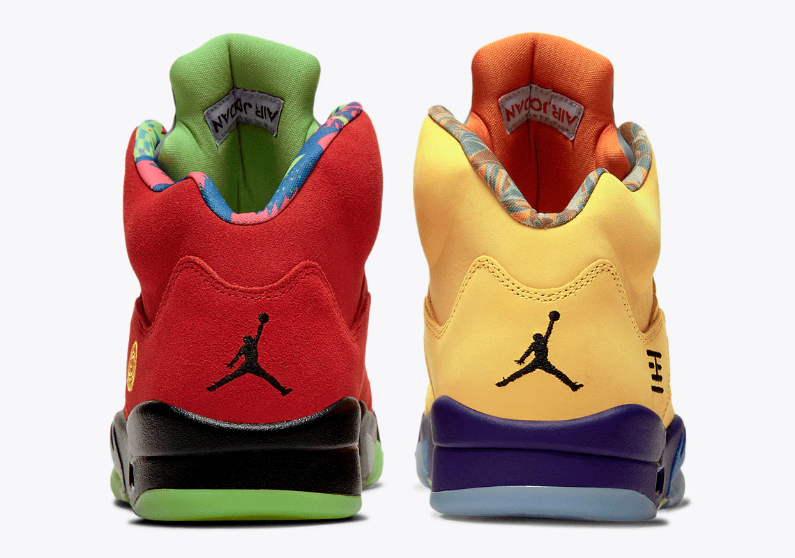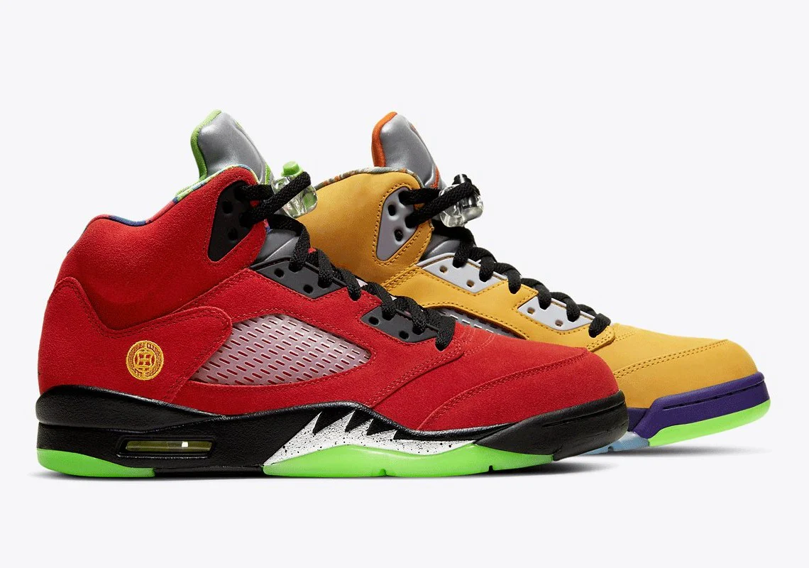 La Air Jordan 5 « What the » honore le 30ème anniversaire de la cinquième chaussure de Michael Jordan avec un mélange de couleurs choisies parmi les modèles les plus populaires et non originaux. Des modèles comme « Quai 54« , « Green Bean« , « Raging Bull » et « Bel-Air » ne sont que quelques-unes des couleurs mentionnées. La chaussure gauche, qui se démonte en marchant, présente le dessus en daim rouge beurre du « Raging Bull », avec le « Quai 54 » qui met l’accent sur la semelle intermédiaire en dents de requin et la langue.
