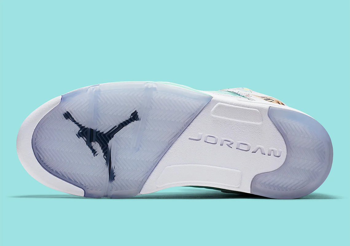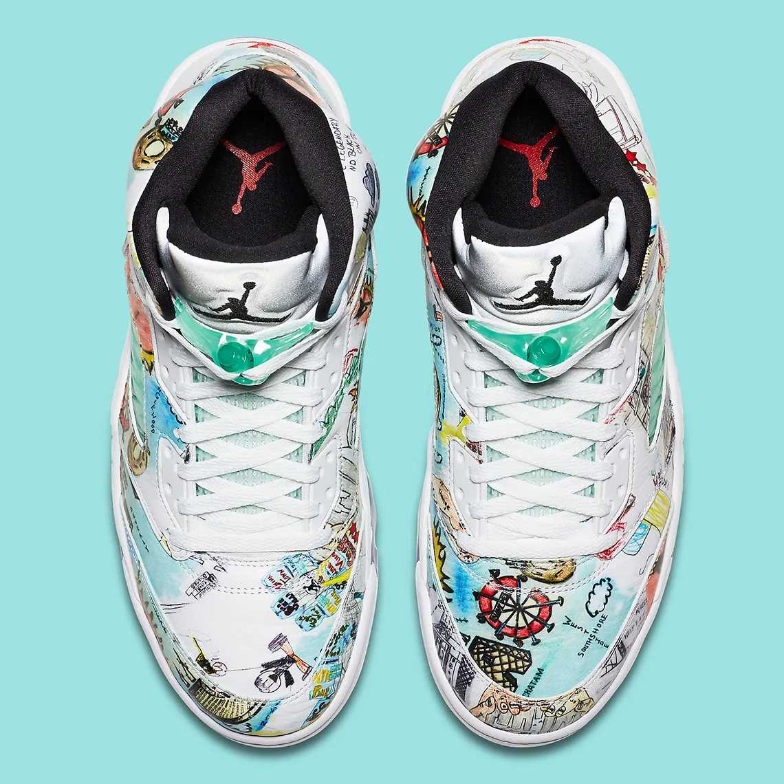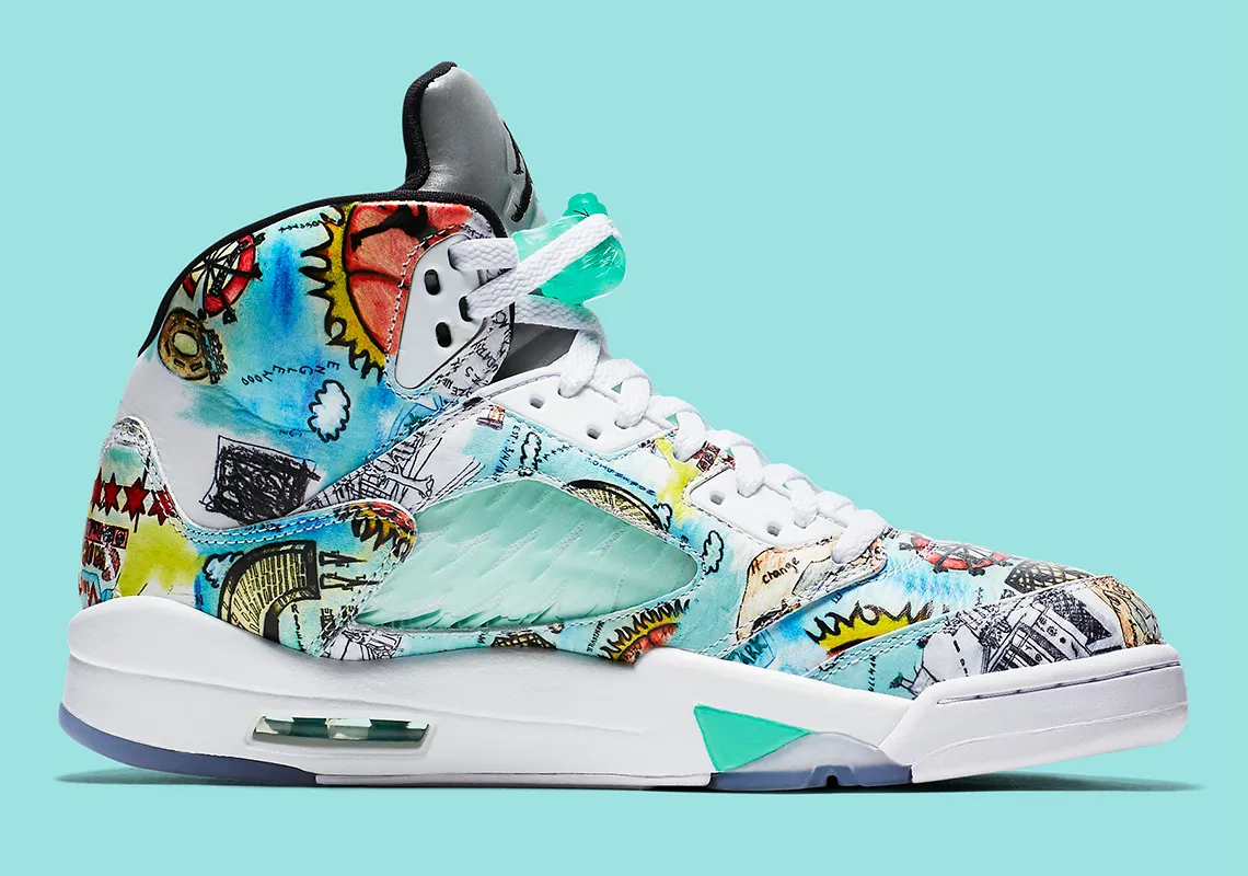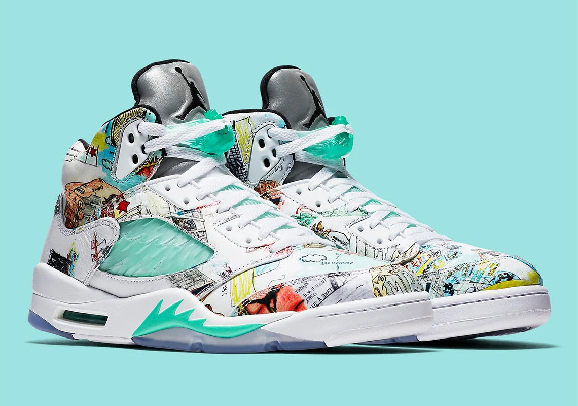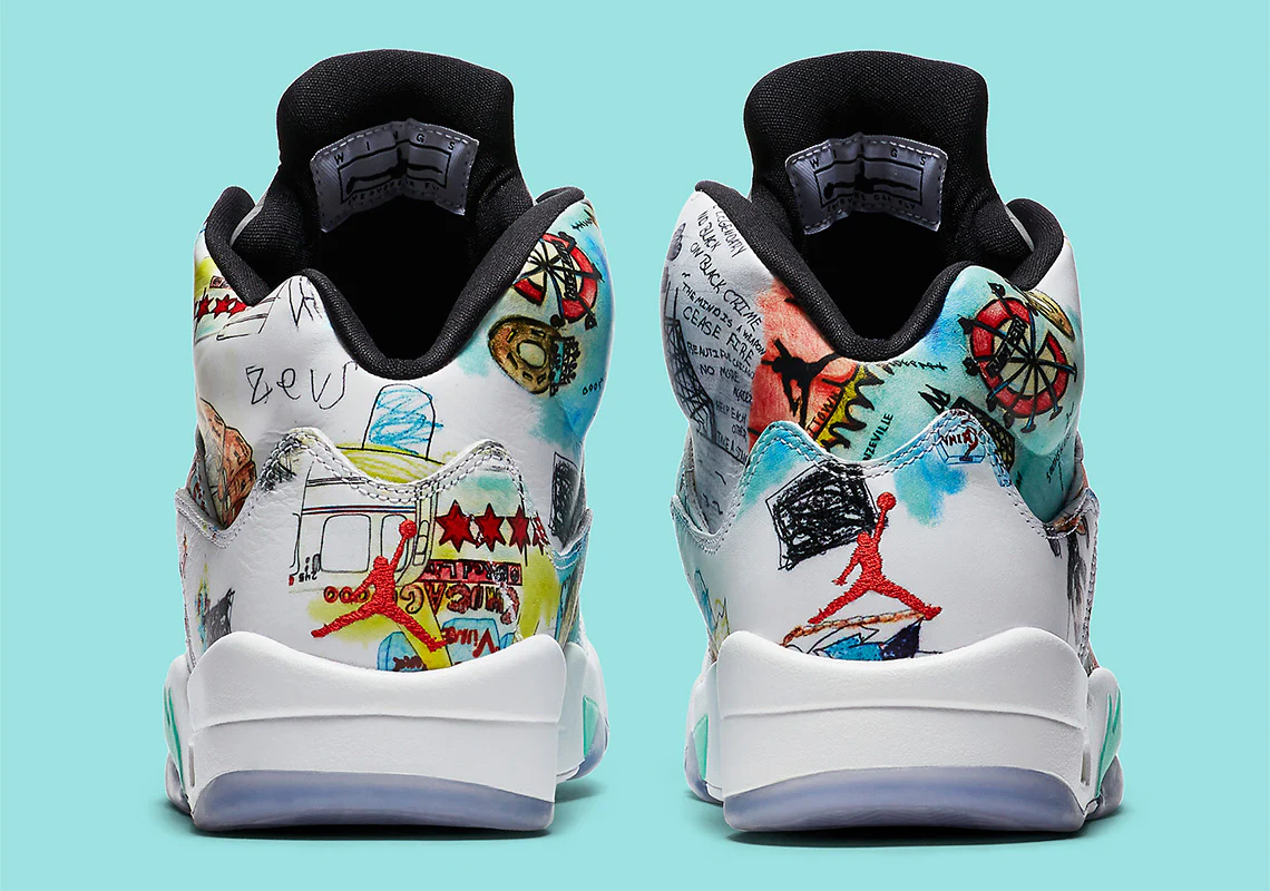 Comme on peut s’y attendre dans le cadre des projets philanthropiques de Jordan, des chaussures spéciales ont été créées par le passé (une Air Jordan 1 et une Air Jordan 12 ont été lancées dans le cadre du programme WINGS) et la troisième sneaker Jordan à bénéficier d’une transformation WINGS est l’Air Jordan 5. Les chaussures spéciales présentent une corne d’abondance de graphiques uniques dessinés à la main par les étudiants du programme, et un vert menthe clair apporte des touches de couleur sur la semelle intermédiaire, le filet en plastique du panneau de custode et la fermeture à lacets. Pour une touche finale spéciale, le quart de la chaussure arbore également un graphisme spécial en forme d’ailes à la place des perforations standard.