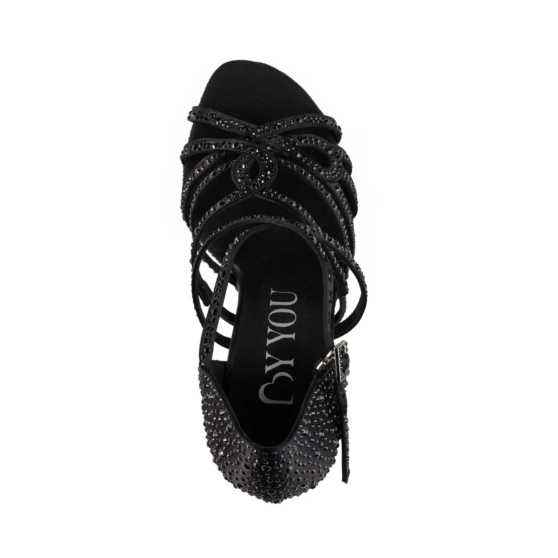 Sublime chaussure de danse en strass et satin avec lanière croisée sur le pied, comportant une semelle flexible à double rembourrage pour encore plus de confort.