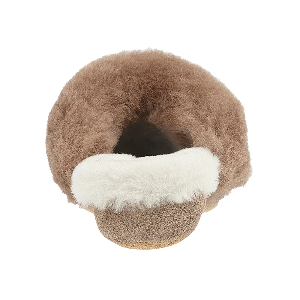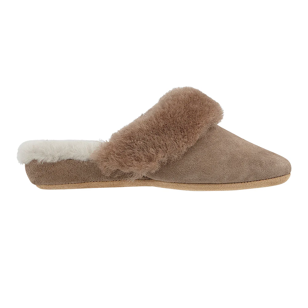 Crafted from soft suede with a plush genuine sheepskin lining and collar, Lucy wraps your feet in natural warmth and breathability. The classic backless mule design makes slipping them on and off effortless, while the suede sole ensures flexible, comfortable movement around the house. A subtle 1½ inch wedge heel gives gentle elevation and an elegant silhouette — perfect for relaxed mornings, quiet evenings, or simply padding around in comfort and style.