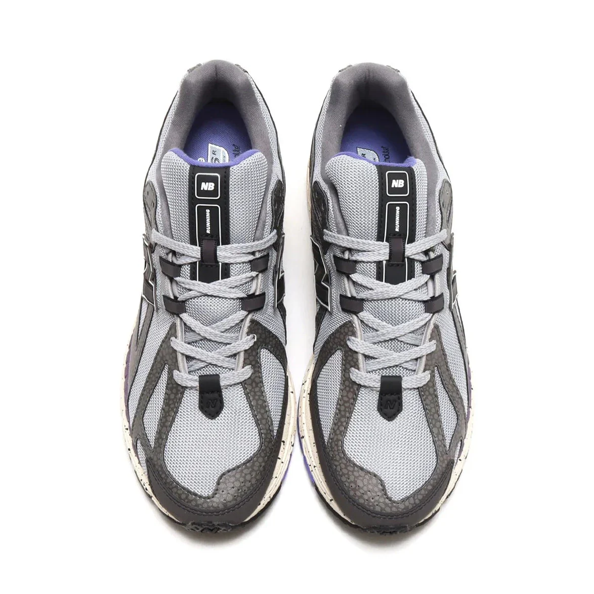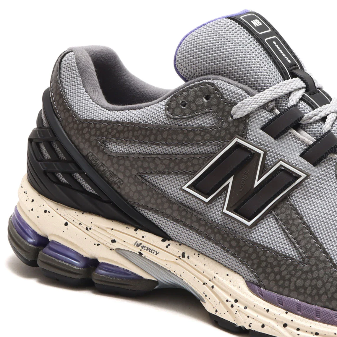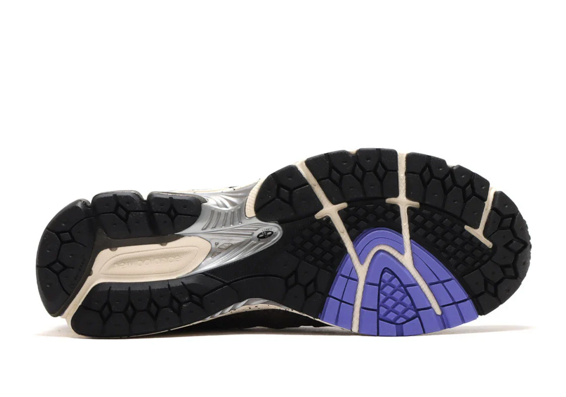 La tige combine un mesh gris acier pour la base, associée à des superpositions en cuir ou textile dans des tons « safari gris ardoise », incluant des inserts réfléchissants qui captent la lumière comme les néons urbains. Un renfort talon en TPU noir structure l’arrière du pied tandis que des touches violet et rose ponctuent la conception — un clin d’œil à l’esthétique “ombre-néon” de Tokyo.
