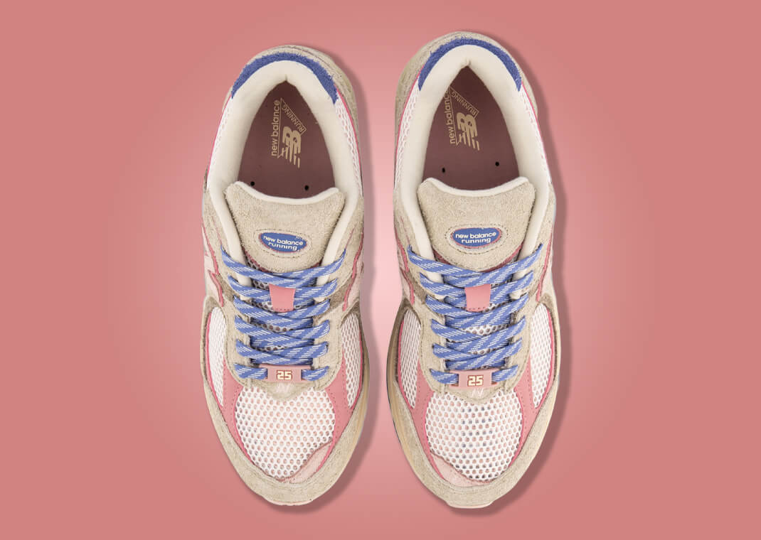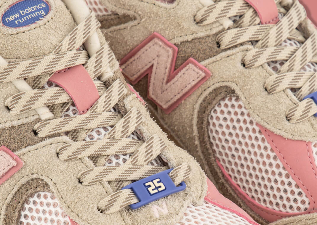 La tige combine un mesh premium et suède/textile dans des tons détaillés : base beige/crème « Natural », touches de rose clair, superpositions bleu profond sur le talon et les œillets, le tout accompagné d’un branding “25” en hommage à l’anniversaire du label Hype DC.