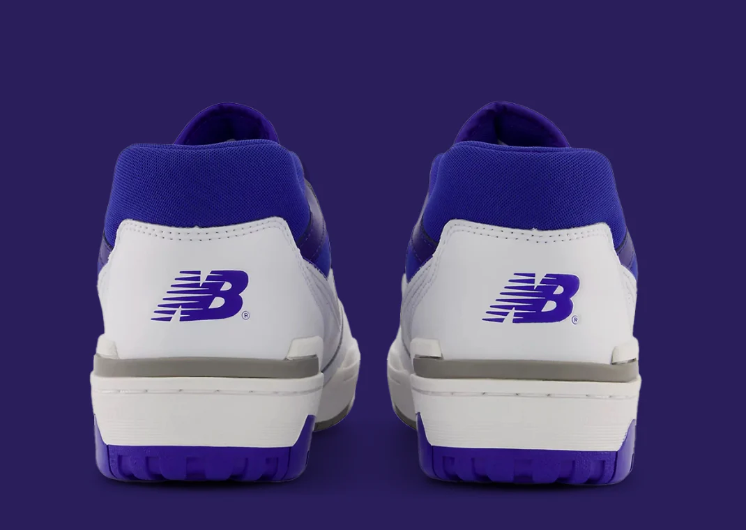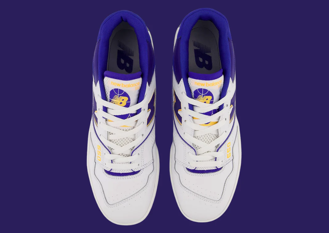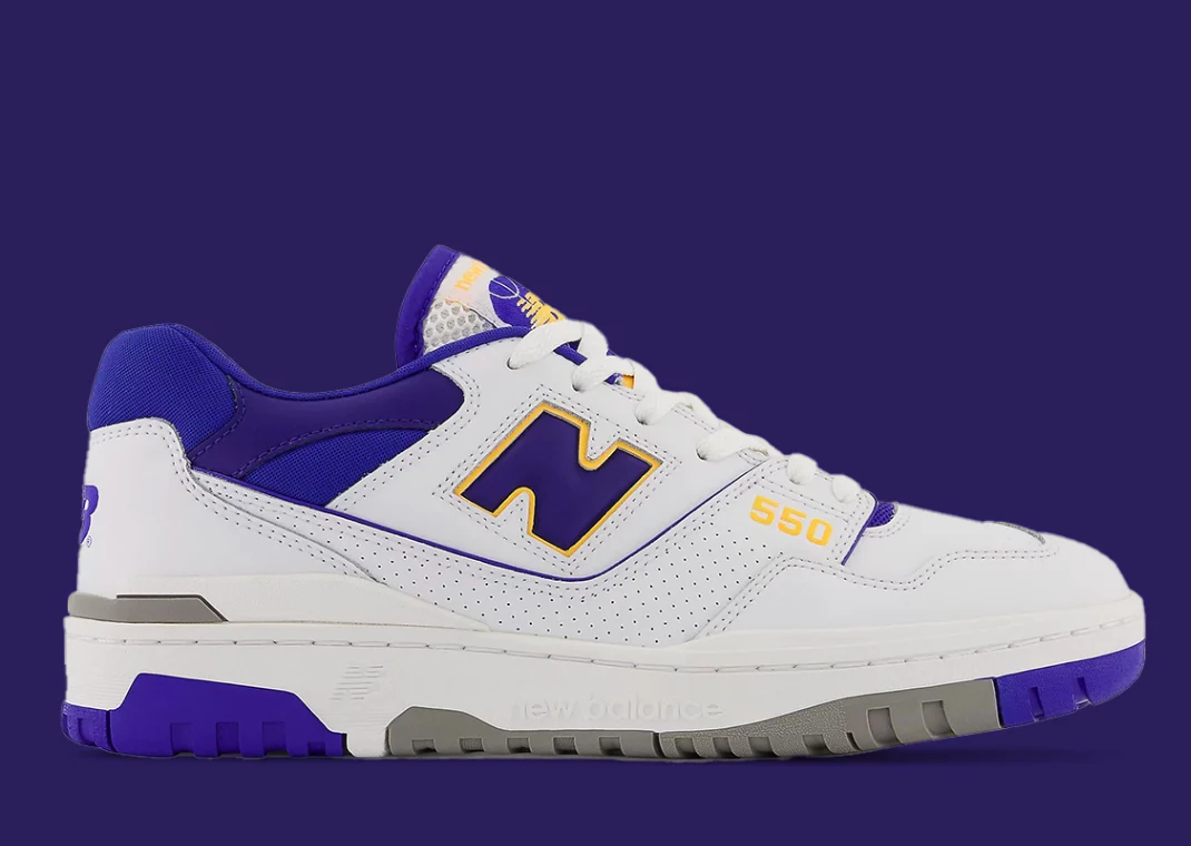 La New Balance 550 “Lakers”, rend hommage à la franchise Los Angeles Lakers avec une palette emblématique mêlant blanc, violet et or, clin d’œil direct aux couleurs légendaires de l’équipe.