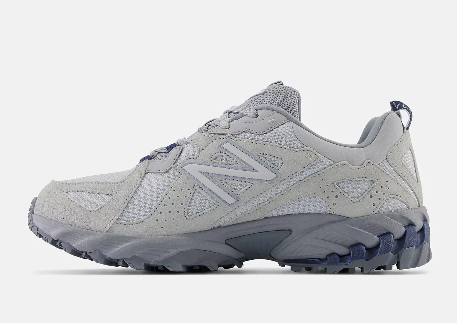 Cette version s’habille d’une palette ton sur ton composée d’un gris aluminium clair pour la base en mesh respirant, sur lequel viennent se superposer des empiècements en suède gris plus foncé (granite). Des touches de bleu marine apparaissent au niveau des œillets, de la languette et du talon, apportant un contraste discret et élégant.