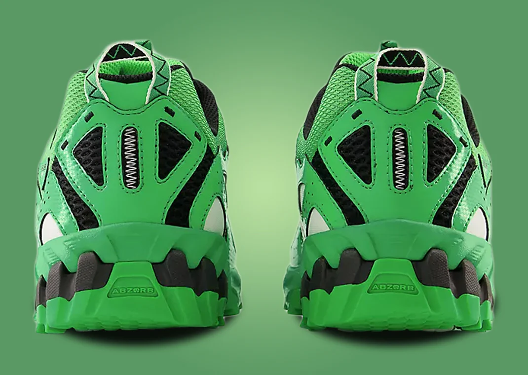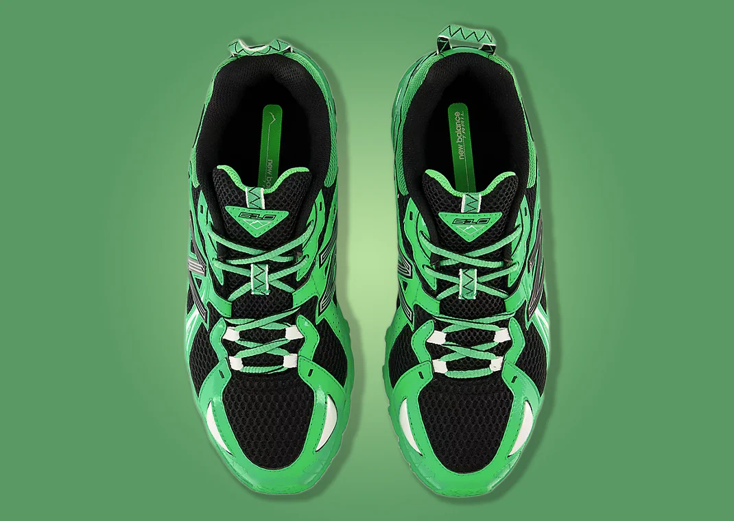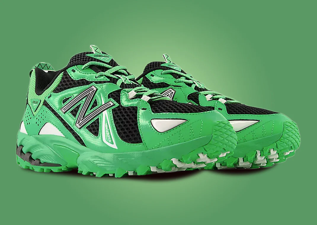 La tige est conçue en mesh respirant, revêtue de panneaux en cuir verni brillant qui accentuent l’éclat du vert et renforcent la texture et la structure du modèle. Les languettes présentent un motif en zigzag inspiré des chaussures de trail classiques, un clin d’œil à l’origine technique de la 610. Sous le pied, l’amorti est assuré par la technologie ABZORB, et la semelle extérieure intègre la bande N-Durance pour une durabilité accrue, consolidant la sneaker dans une utilisation urbaine exigeante.