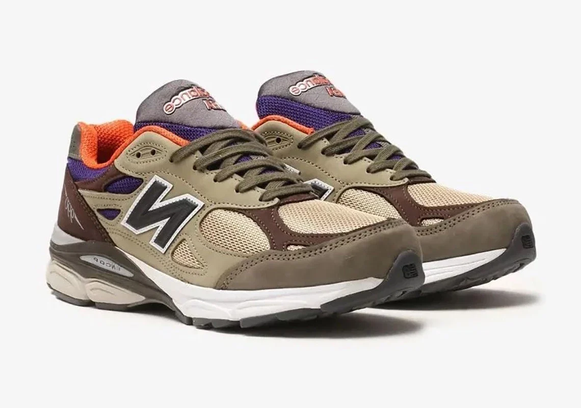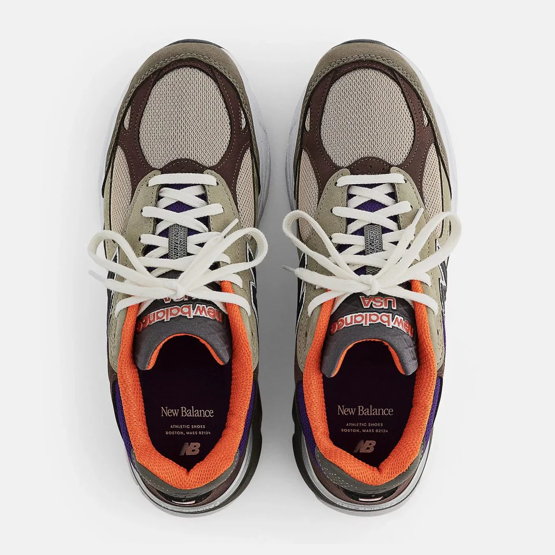 La collaboration entre Teddy Santis et New Balance revisite la légendaire silhouette 990v3 “Made in USA” dans une version aux tonalités audacieuses : la “Khaki/Orange”. Conçue avec soin, cette édition propose une tige en mesh beige clair associée à de généreuses superpositions en nubuck kaki/marron, contrastées par des touches orange vif sur la doublure et la languette.