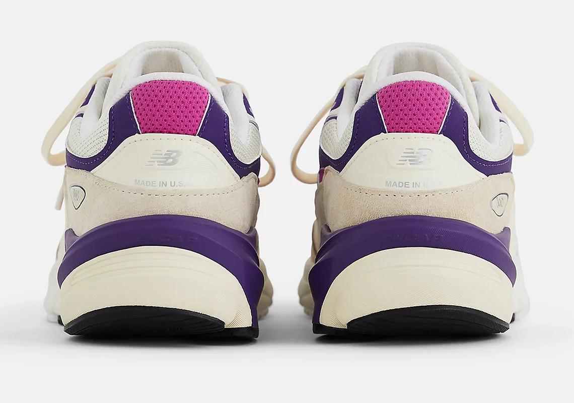 Cette version de la 990v6 se distingue par une palette audacieuse : le nom “Magenta Pop” évoque les accents violets et roses éclatants qui viennent ponctuer une base principalement « macadamia nut / off-white », créant un contraste visuel fort.