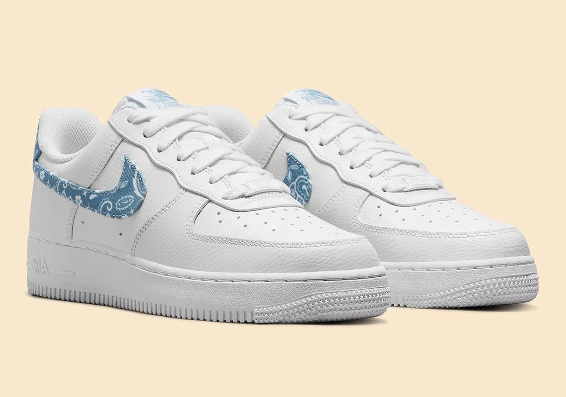 La Nike Air Force 1 Low ’07 Essential White Worn Blue Paisley revisite l’icône de 1982 avec une touche délicatement rétro grâce à son motif paisley bleu vieilli. Sa tige en cuir lisse blanc premium crée une base immaculée et intemporelle, tandis que le swoosh et le talon habillés du Worn Blue offrent un contraste doux et élégant. Le motif cachemire, subtilement texturé, apporte une dimension artisanale et tendance qui donne à la sneaker une identité unique.