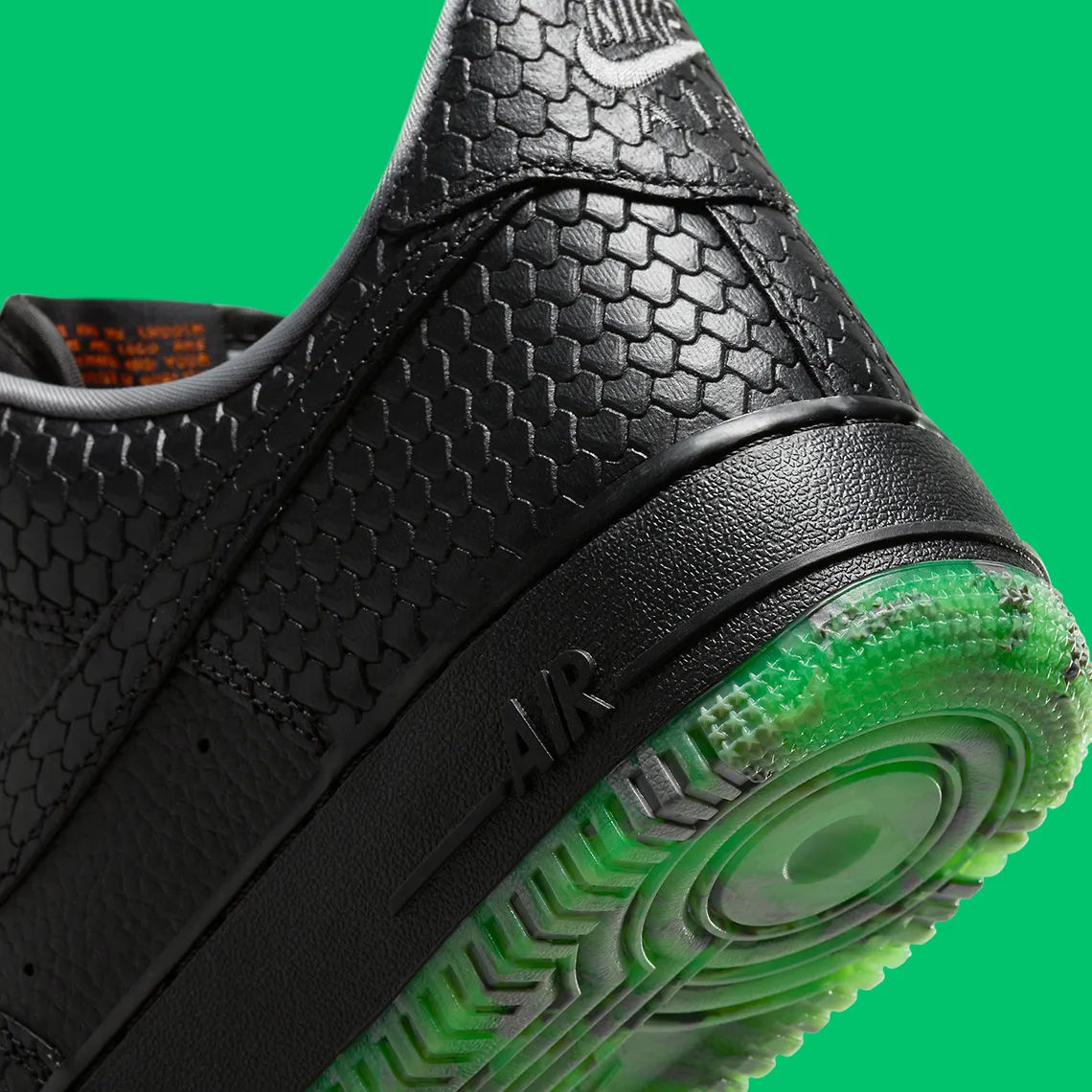 Au design un peu plus festif que celui des sorties de 2022, la Nike Air Force 1 « Halloween 2023 » débute par une base noircie, dont la construction alterne entre un cuir foulonné et une peau de serpent en relief. Des nuances de vert épouvantables peignent ensuite la semelle extérieure à motifs, tandis que des oranges vifs mettent en valeur non seulement le texte Nike sur la languette, mais également la menaçante Jack-o’-Lantern imprimée sur les semelles intérieures. Cette citrouille macabre fait encore une autre apparition à l’extérieur, accessoirisant l’unité de dentelle dans une finition argentée.