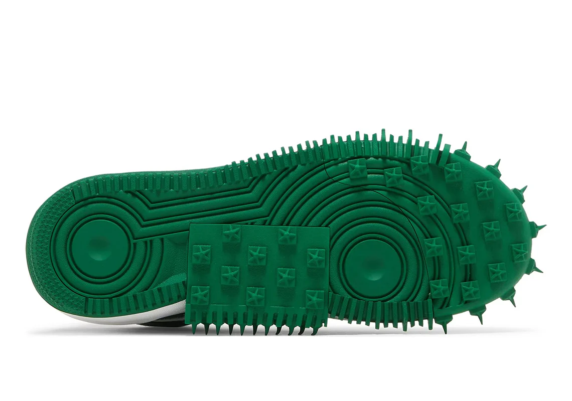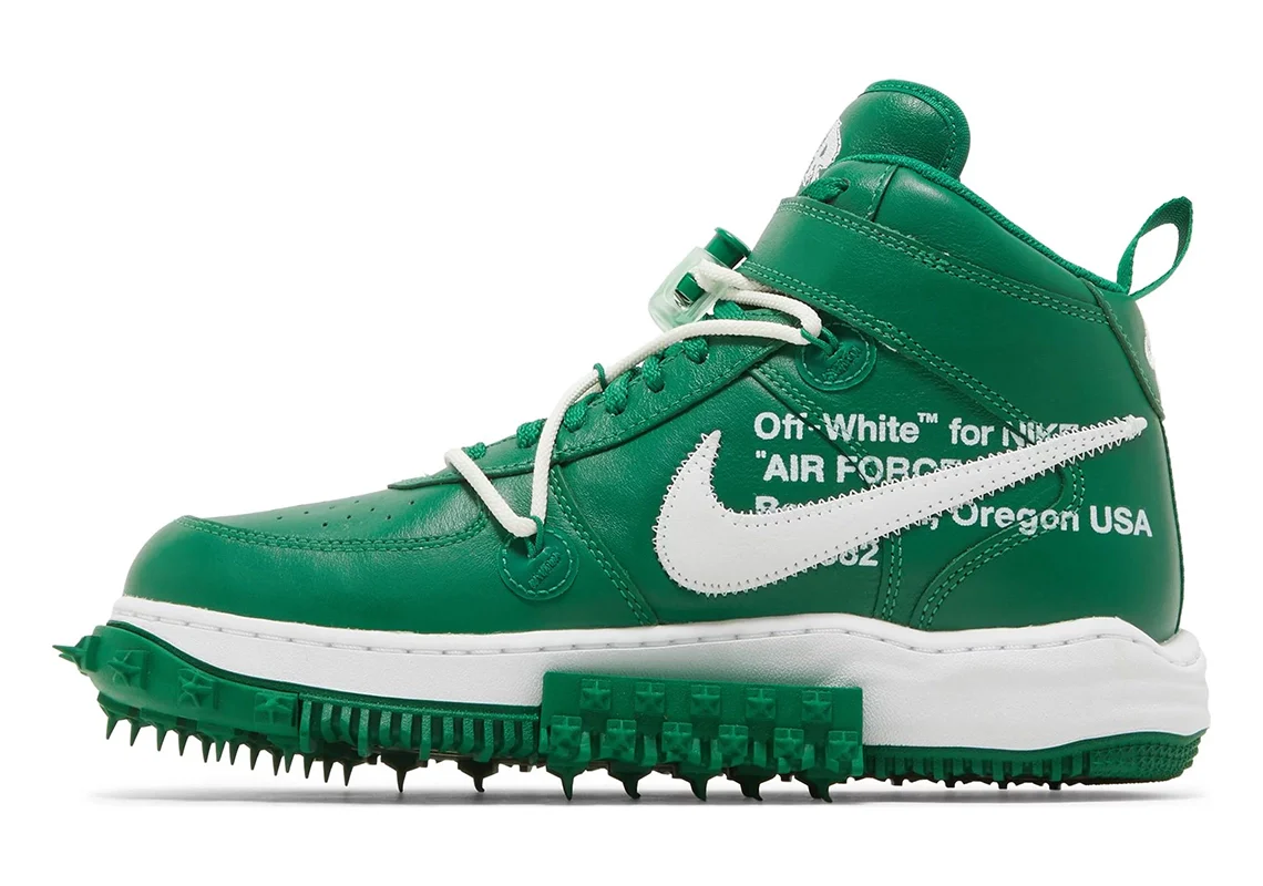 La Nike Air Force 1 Mid Off-White Pine Green revisite la silhouette montante emblématique à travers la vision avant-gardiste de Virgil Abloh. Sa tige en cuir Pine Green, un vert profond vibrant et texturé, sert de base à l’esthétique déconstructive propre à Off-White : coutures visibles, pièces techniques superposées, éléments ajourés et détails industriels parfaitement assumés. Le Swoosh blanc, fixé par des points de couture apparents, apporte un contraste fort et un effet “prototype” cher au designer.