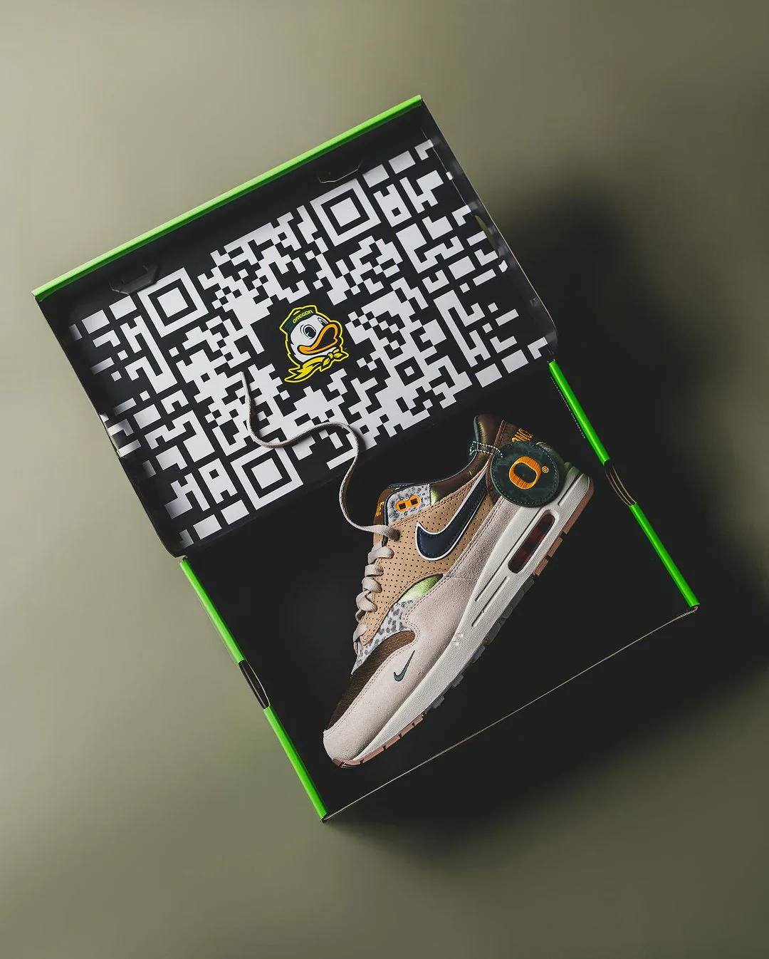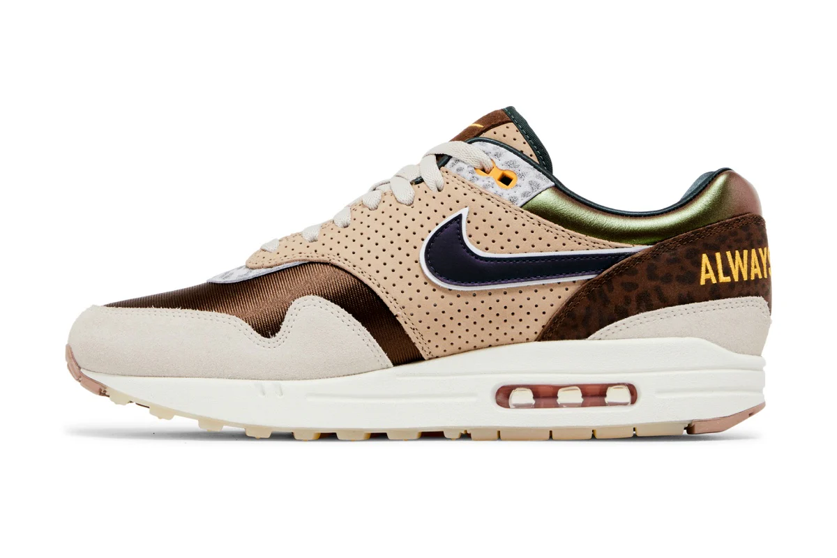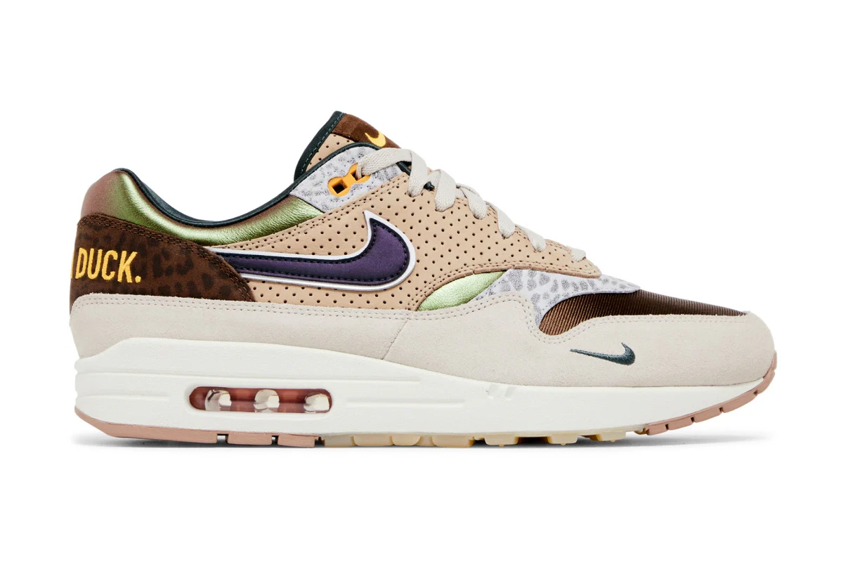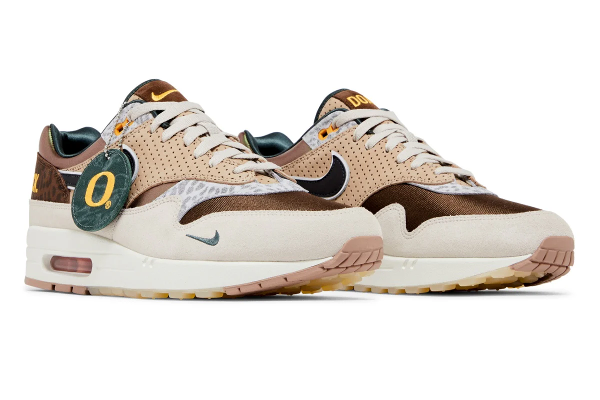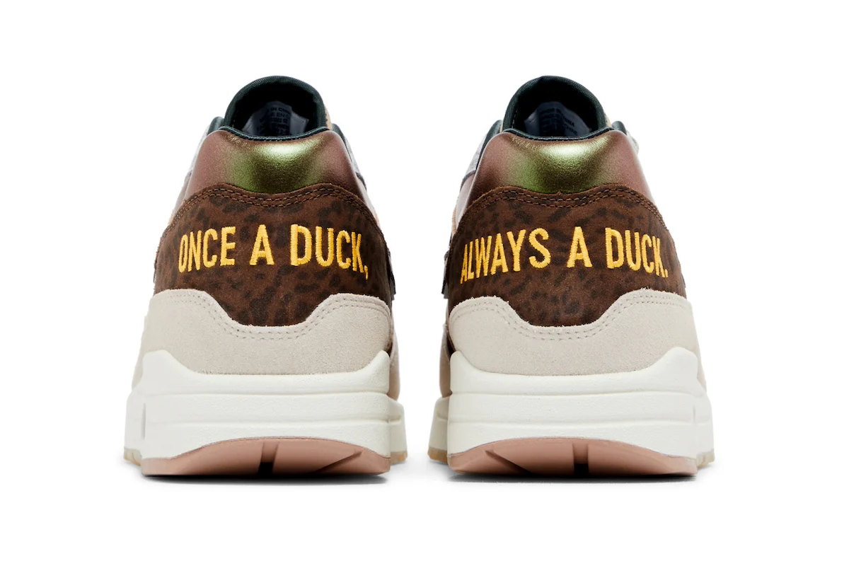 Cette édition premium de la AM1 ’87 mêle un travail de matériaux extrêmement soigné et une palette inspirée de l’esprit “Duck” de l’université de l’Oregon. On retrouve une tige composée d’un mesh irisé marron à l’avant, d’un col vert éclatant en contraste, ainsi que des renforts en cuir brun perforé. Le garde-boue en daim beige, le talon en daim moucheté marron et les surimpressions « Once A Duck, Always A Duck » brodées à l’arrière renforcent le storytelling dédié à l’identité de l’établissement.