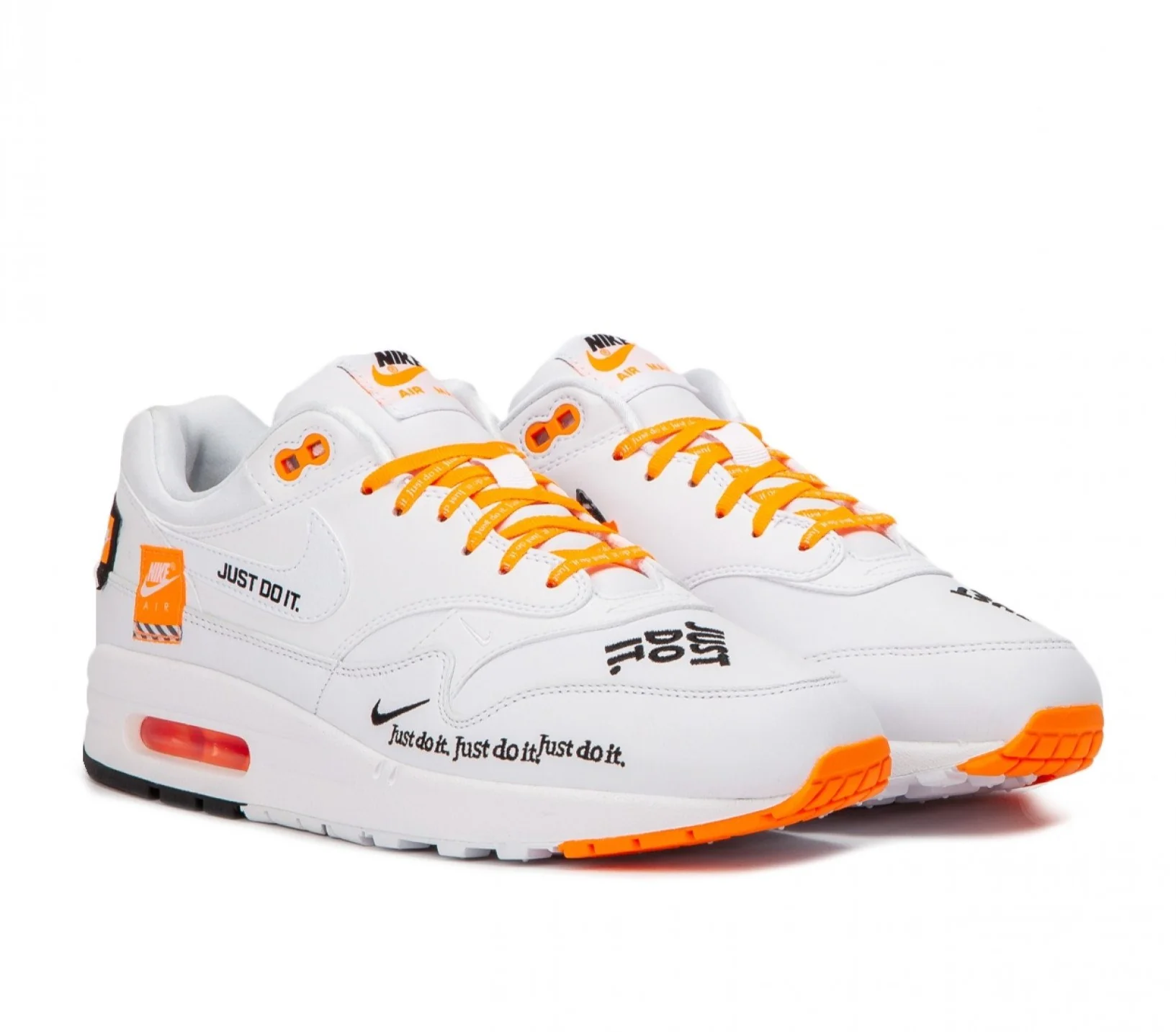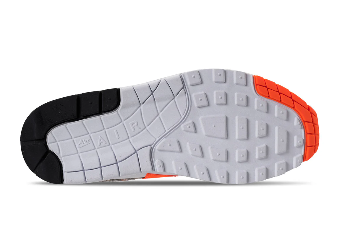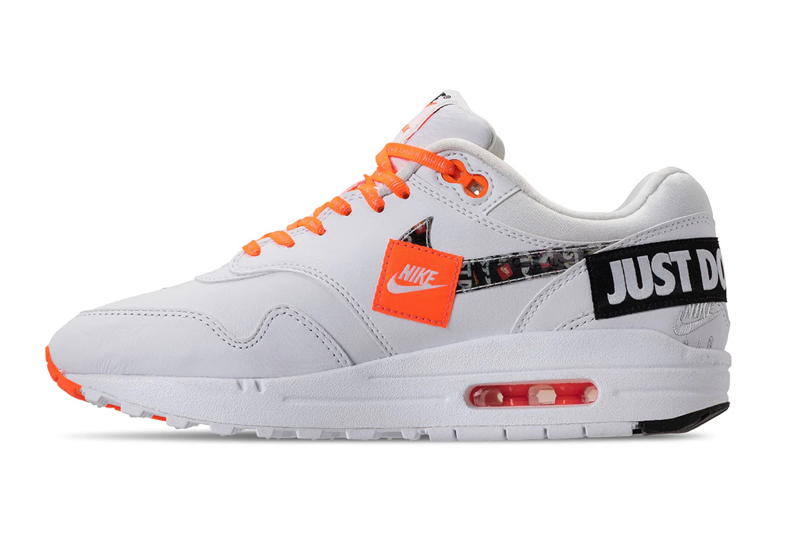 Le slogan « Just Do It » peut être vu tout au long de l’ Air Max 1 de plusieurs manières, sur les lacets dans un imprimé intégral, un panneau d’affichage brodé sur le talon et d’autres textes divers sur des éléments tels que le garde-boue et le Swoosh au milieu du pied.