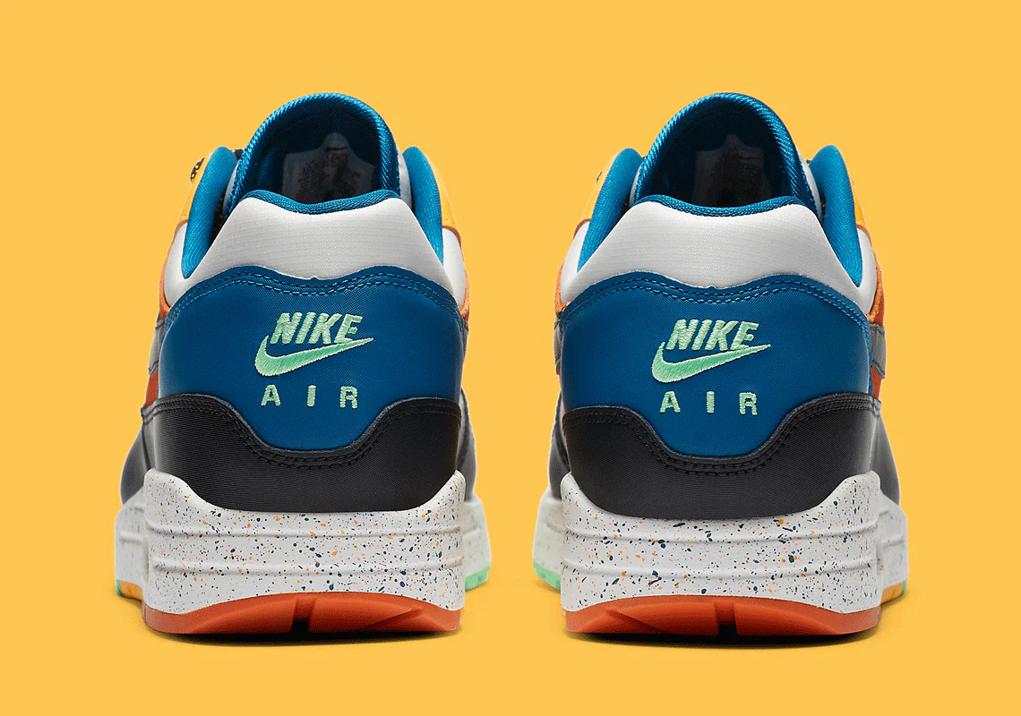 L’ empeigne en mélange de matériaux de l’Air Max 1 est légèrement modifiée pour plus de durabilité, car les garde-boue emblématiques présentent une construction en toile. Alors que les superpositions sur la gorge et au talon de la chaussure se livrent également au tissu grossier, elles arborent des teintes jaunes et bleues plus vibrantes.