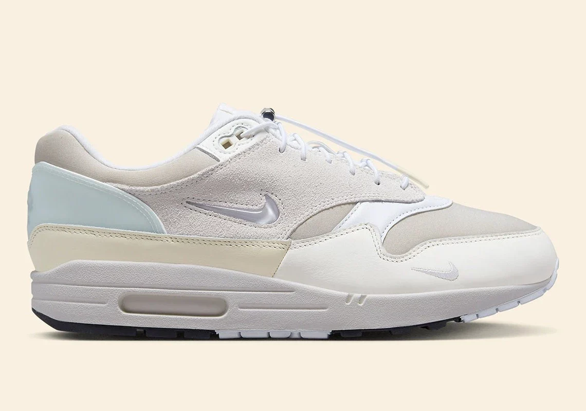 D’autres devraient sortir plus tard cette année, y compris, mais sans s’y limiter, cette offre, qui présente un large éventail de modifications. La base elle-même est remarquable, incorporant des daims et du cuir de première qualité dans toute la construction. En outre, la maille qui habille généralement la boîte à orteils et le col du modèle est remplacée par un nylon beaucoup plus lisse. Ces matériaux sont ensuite recouverts d’une série de tons neutres, du blanc au crème clair, qui complètent le look simple et épuré du lacet métallique argenté, du Swoosh bijou et de la bulle d’air.