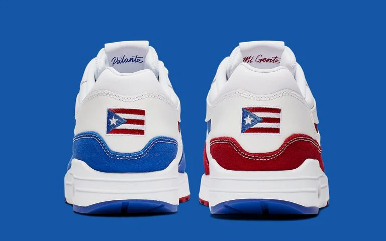 Parmi les détails particuliers, citons les Swooshes latérales découpées à l’emporte-pièce, la texture bosselée des garde-boue inspirée de la peau d’autruche, les lacets rayés, les drapeaux portoricains brodés sur chaque talon et le message « Palante Mi Gente » à l’intérieur des langues. L’Air Max 1 « Puerto Rico » est sorti le 1er juin 2019 en quantités limitées.