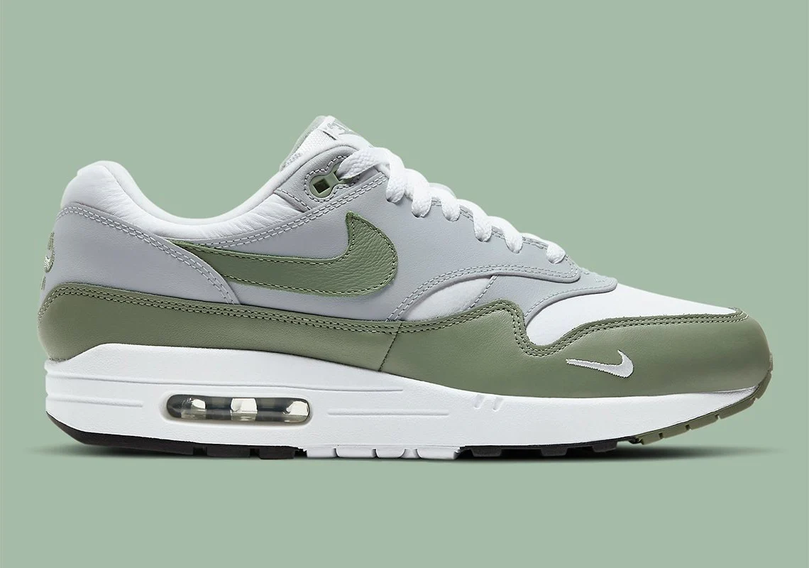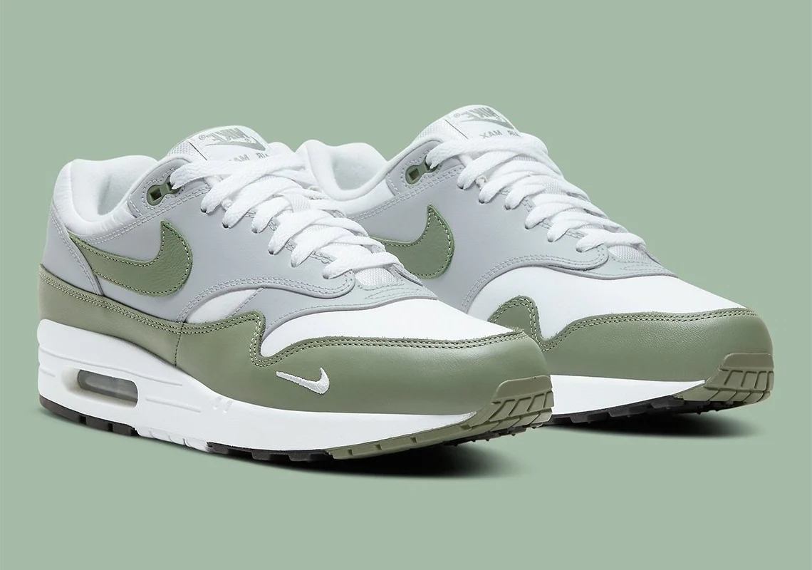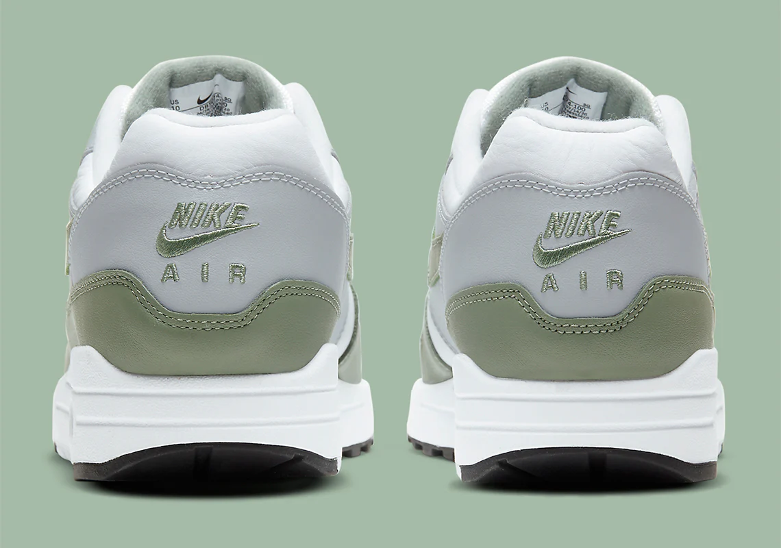L‘Air Max 1 Premium ‘Spiral Sage’ présente un look neutre sur sa construction tout en cuir. La base blanche de la chaussure est recouverte de Wolf Grey, avec Spiral Sage sur la marque Swoosh et le garde-boue. Un mini-Swoosh sur l’avant-pied accentue le look, tandis que sous le pied, la semelle intermédiaire abrite un Max Air visible dans le talon pour offrir un amorti. Une semelle extérieure gaufrée en caoutchouc tricolore est incluse pour la traction.