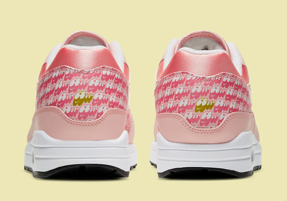 Une variante légèrement plus sombre de la teinte rose est utilisée sur le revêtement en cuir de la pointe au talon avec la marque « Nike » de style rétro. D’autres marques ont été intégrées au design, notamment un Swoosh en cuir rose sur le panneau central, l’insigne classique « Nike Air » sous un graphique de fraise sur la languette et un petit logo « Air » jaune à l’arrière de la chaussure. Date de sortie : 12 novembre 2020.
